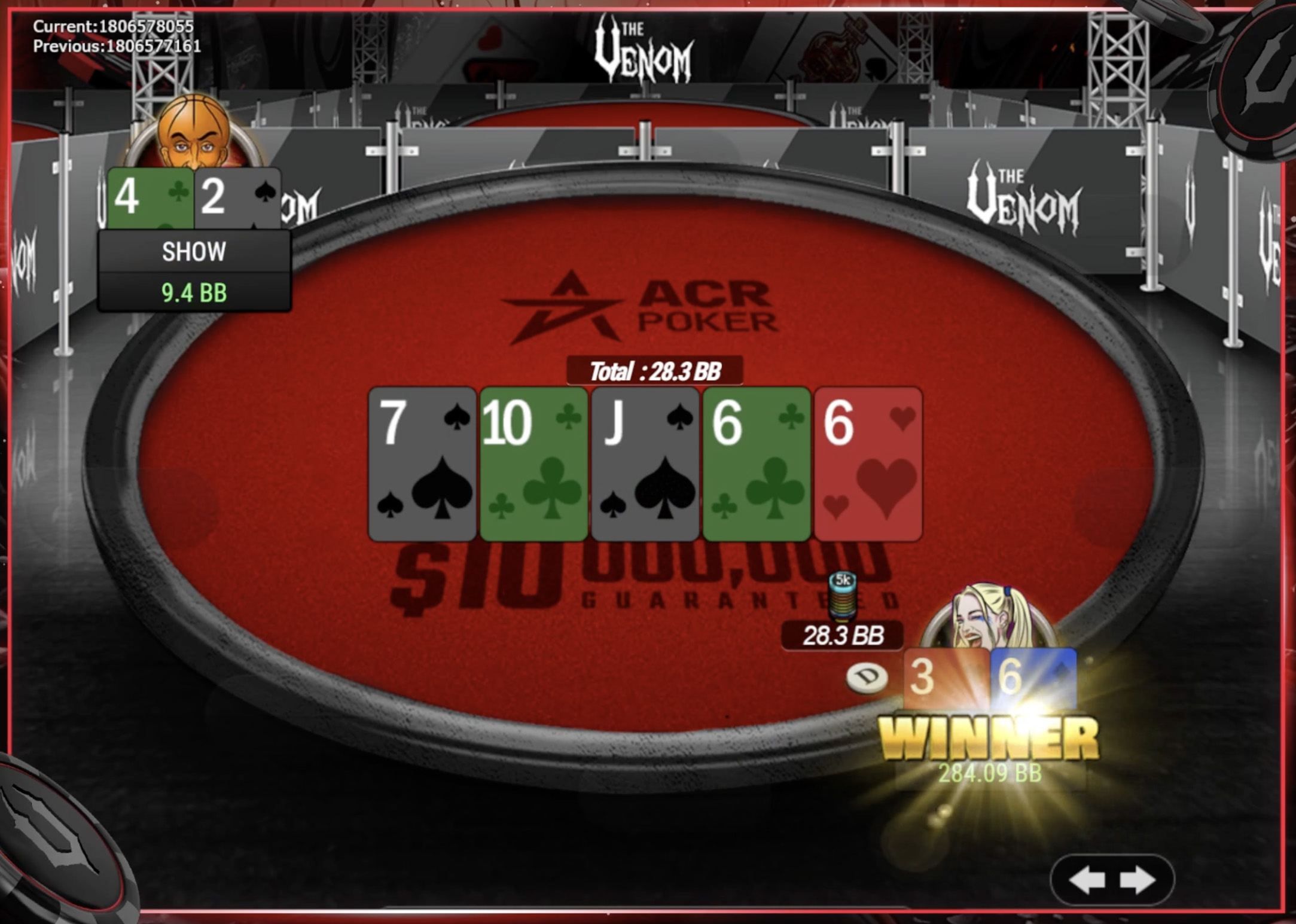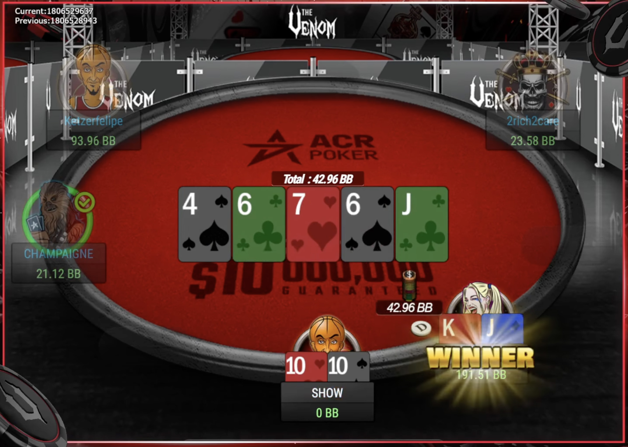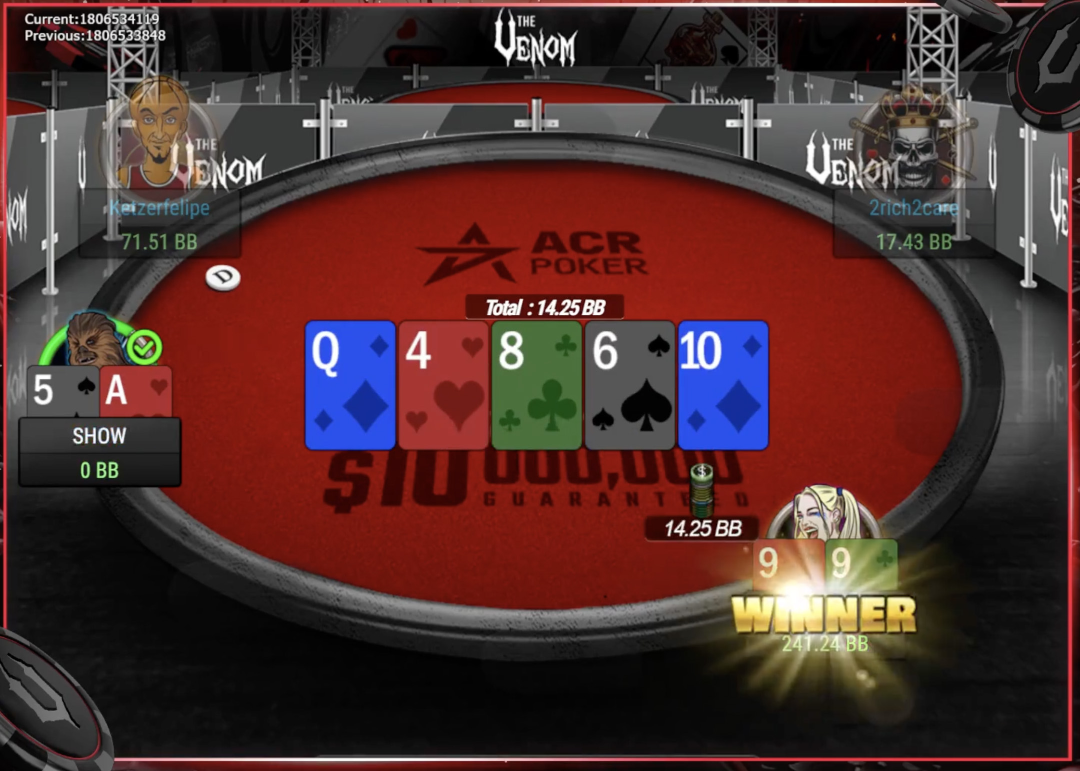 За пять флайтов $2,650 The Venom $10M GTD собрал 3,529 входов. Турнир прошёл с оверлеем $1,195,000.