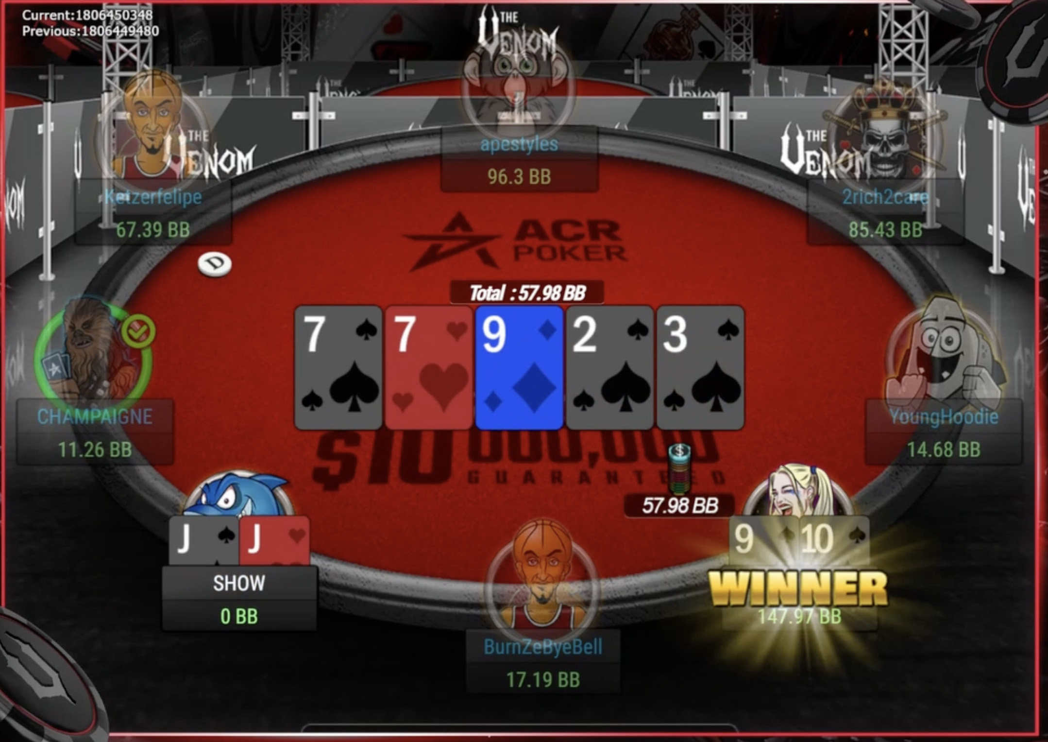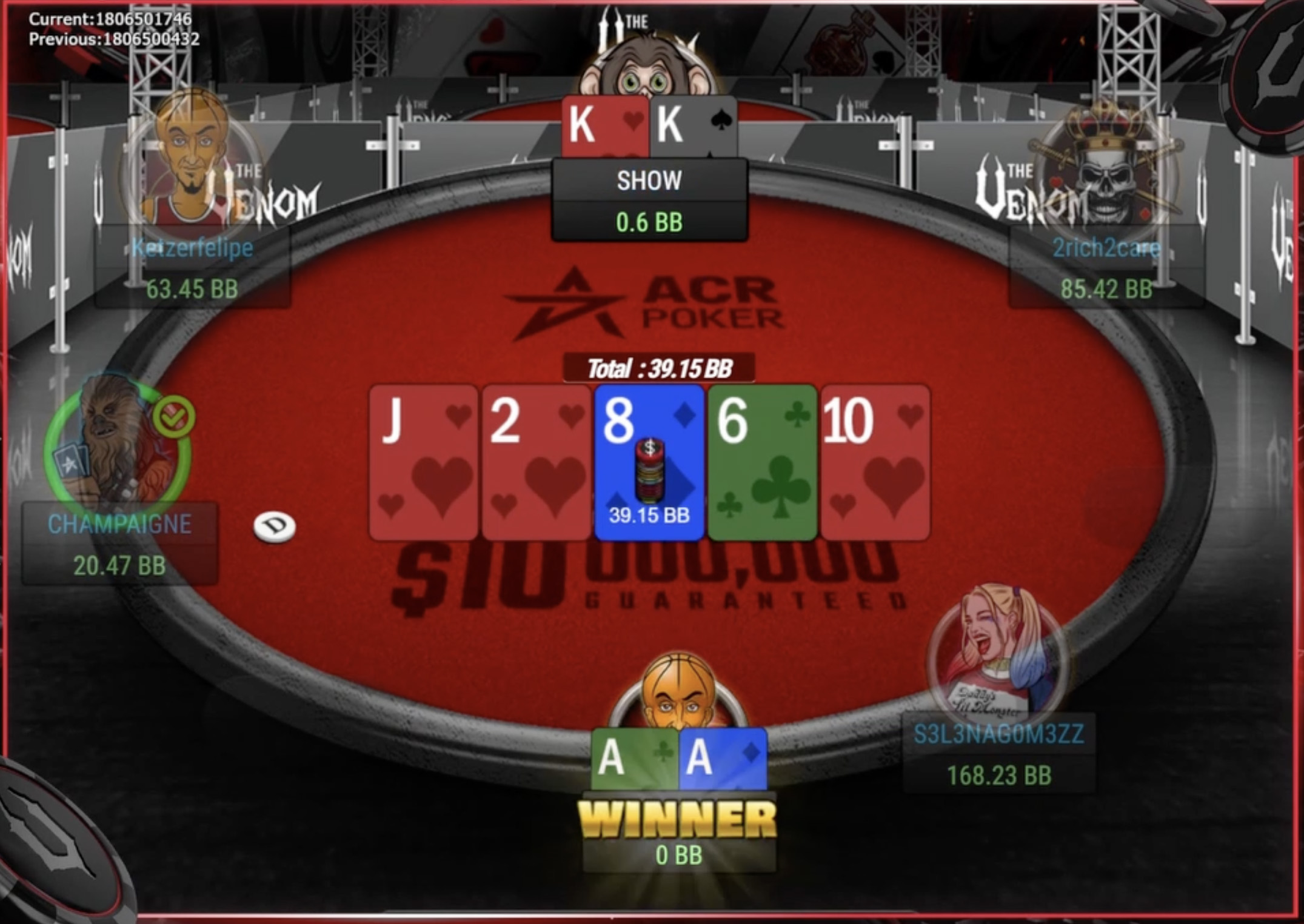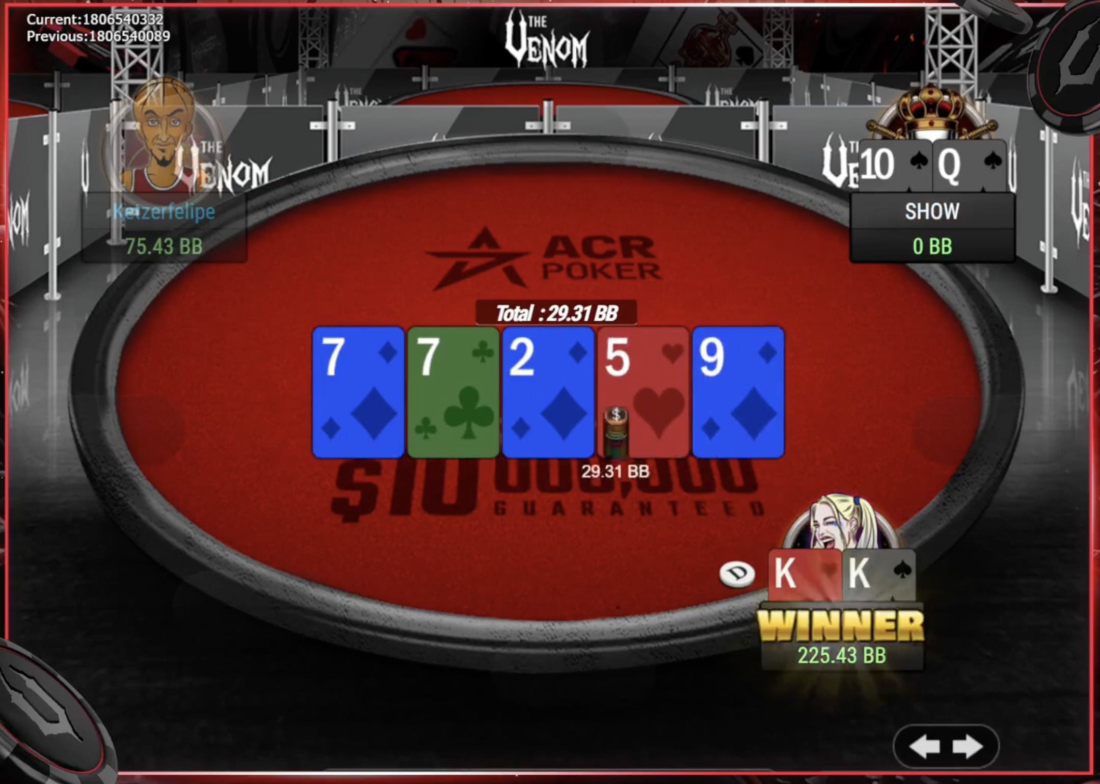 За пять флайтов $2,650 The Venom $10M GTD собрал 3,529 входов. Турнир прошёл с оверлеем $1,195,000.