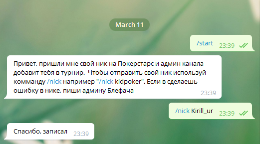 С ботом нужно провести лаконичную беседу, просто сообщив ему свой никнейм на PokerStars.