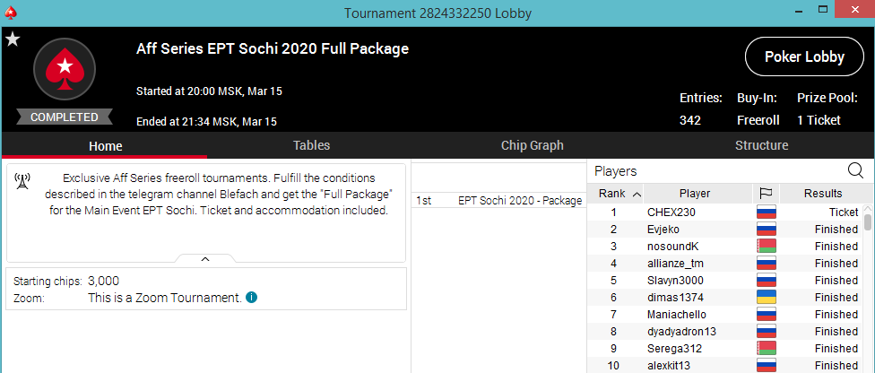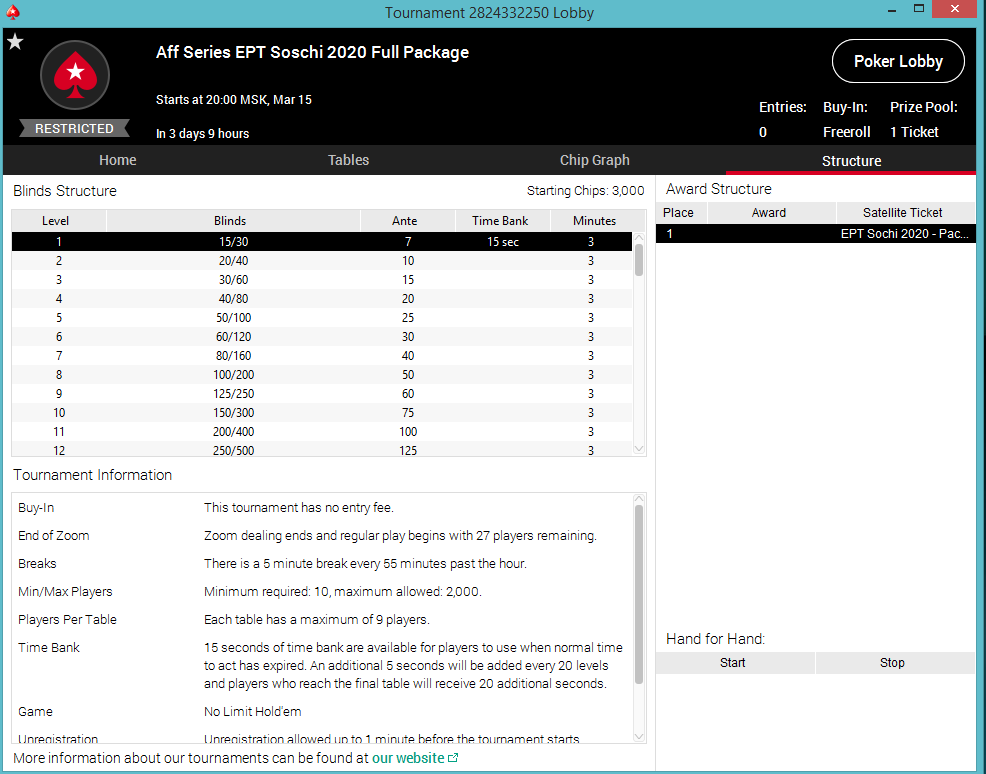 Не регистрируйтесь в турнире, если у вас нет планов или возможности играть в Сочи, выигрыш не компенсируется деньгами или билетами на других сериях PokerStars.