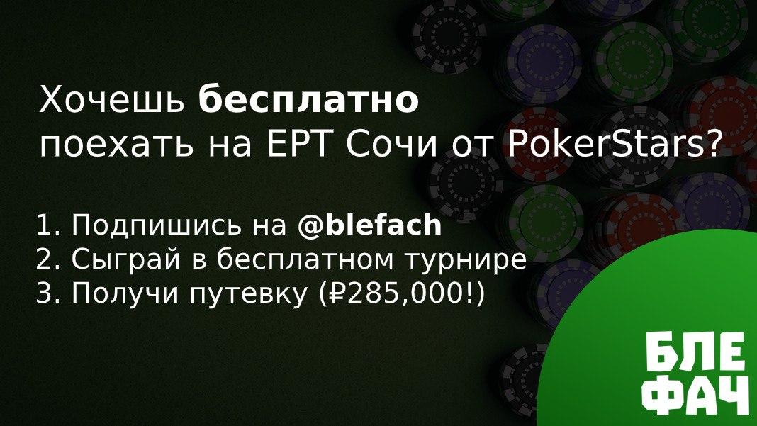Телеграм-канал Блефач решил разыграть билет в Main Event EPT Sochi c проживанием и компенсацией расходов на дорогу. На регистрацию в турнире у вас ровно 13 часов — в 23:59 MCK 12 марта прием никнеймов будет остановлен.