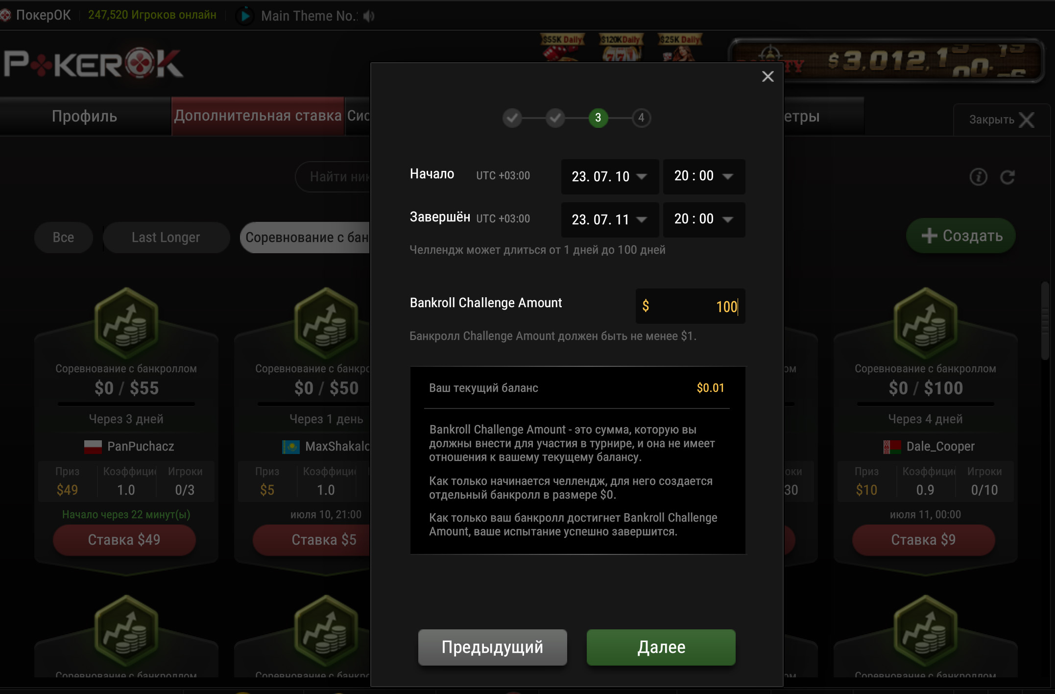 Чтобы заключить пари Bankroll Challenge, нужно: