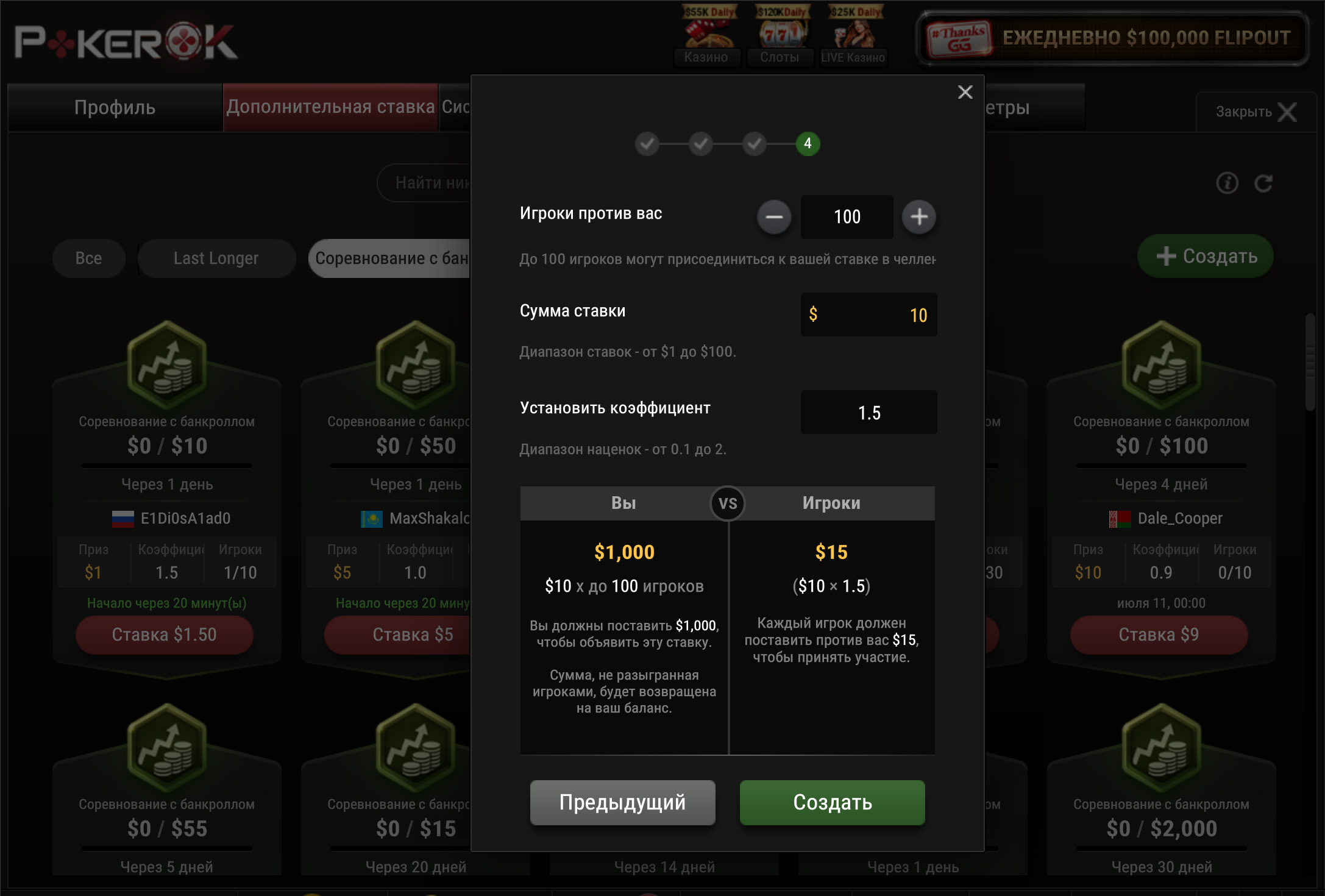 Например: вы создали пари, что за 10 дней сможете набить банкролл в $1000. В пари участвует 100 человек. Ставка = $10 с коэффициентом х1,5 (каждый игрок ставит по $15).