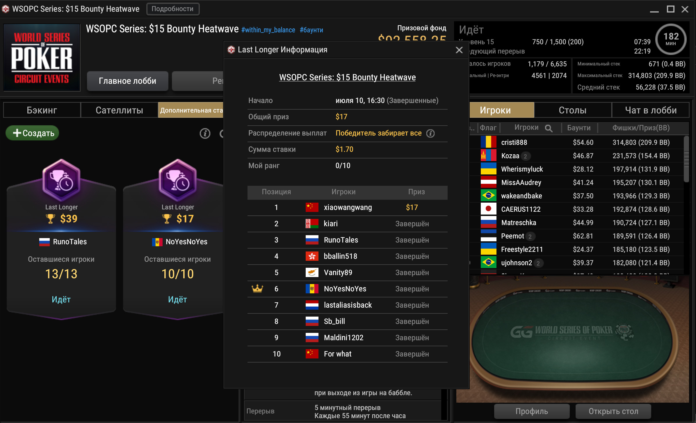 На ПокерОК можно заключать пари на Ласт Лонгера можно в обычных турнирах, Battle Royale и AoF Sit&Go.