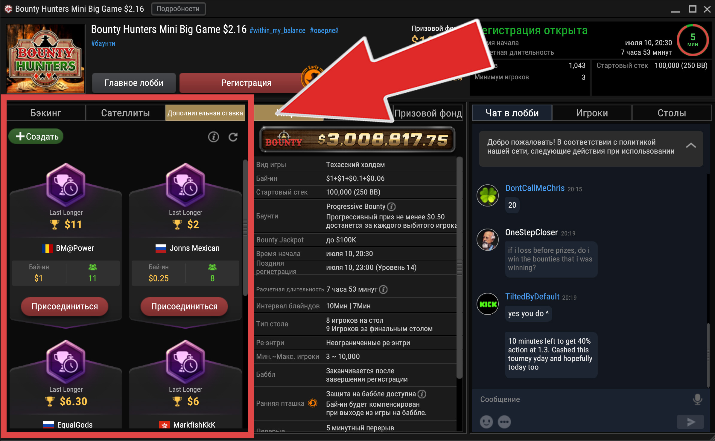 2. В лобби турнира во вкладке «Дополнительная ставка» кликнуть «Создать» или «Присоединиться» к уже существующему пари.