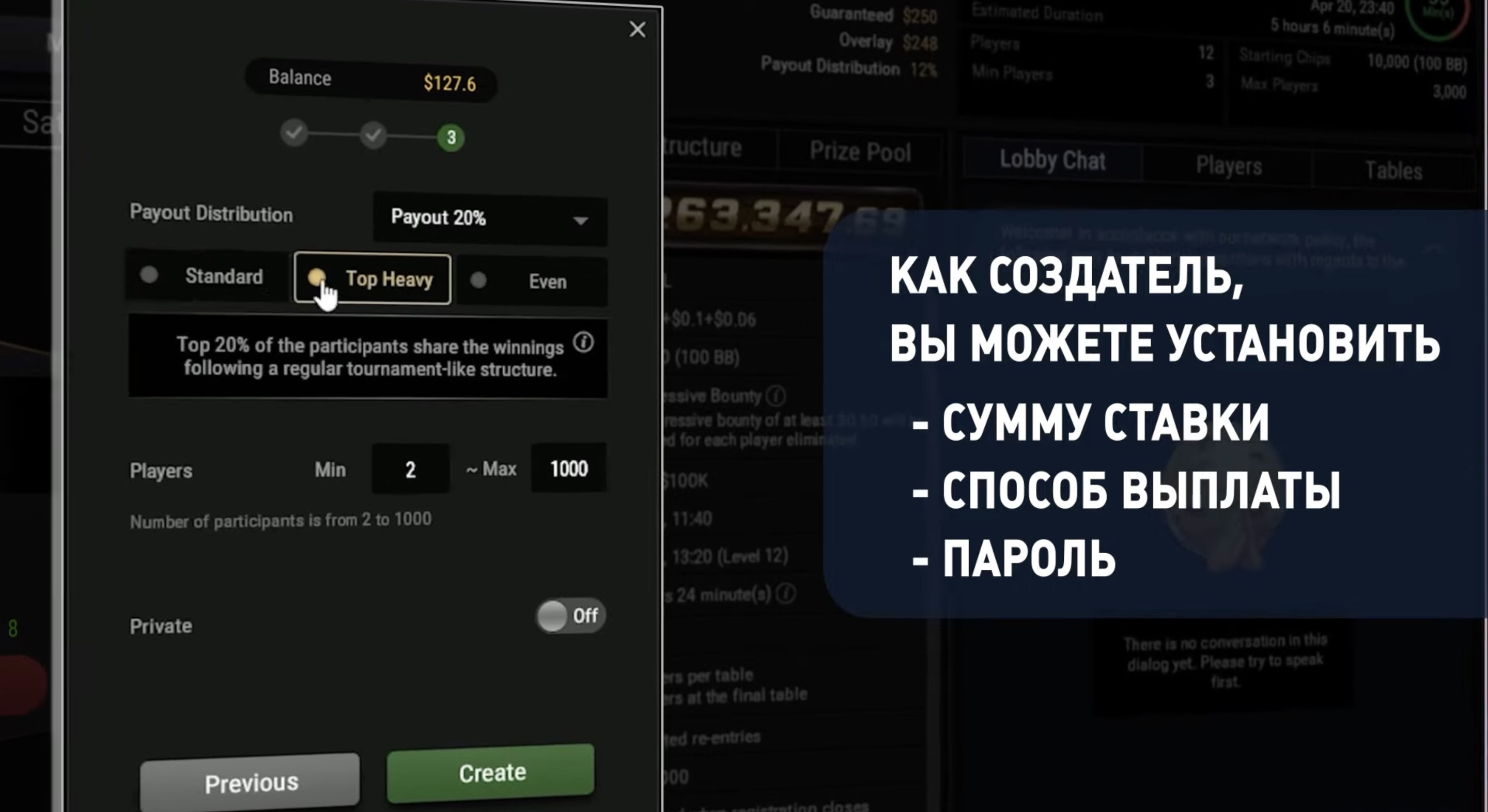3. Для нового пари нужно выбрать сумму ставки и способ выплат: «Победитель забирает всё» или «Выплата распределяется среди % участников».