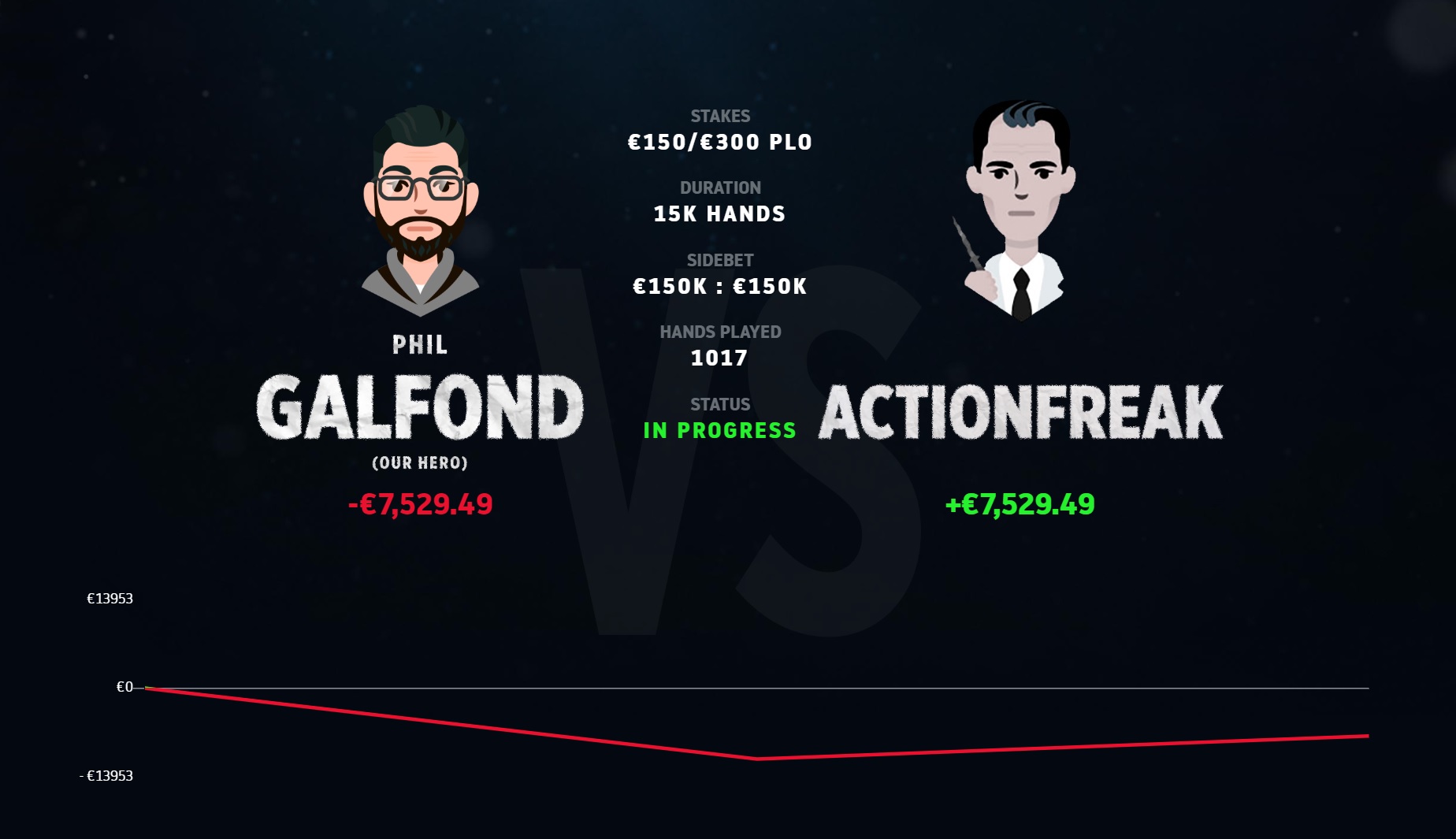 По итогам двух сессиий Гальфонд впереди на 4 бай-ина. Для победы нужно выиграть ещё 16, и судя по всему, продолжительность этого поединка будет существенно короче максимально заявленных 50’000 рук.