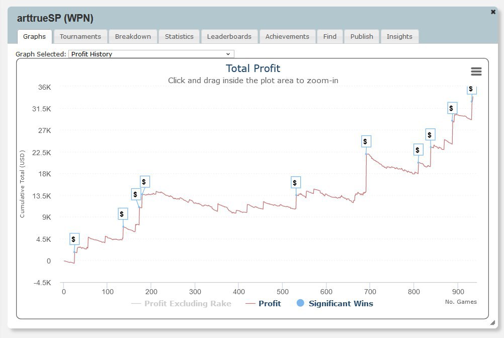 Теперь его профит в руме почти доходит до $34K на 934 турнира ABI$49.