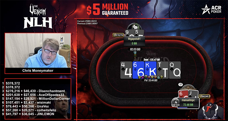 Rigapols81 овербет-пуш 82 бб в банк 53 бб. У manuelmpc в стеке оставалось 73 бб. Он сжёг 10-секундный тайм-банк и нашёл хиро-колл. Засыпающий Манимейкер даже не поверил своим глазам и произнёс: