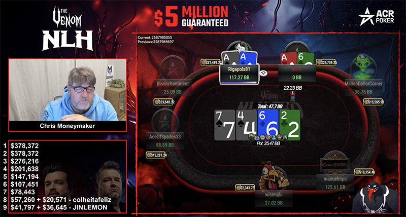MillionDollarCorner также пал от рук Спирина в коинфлипе с АКо vs 99 за банк 70,5 бб. Пятое место в Venom обеспечило ему бест-кеш на PokerKing.