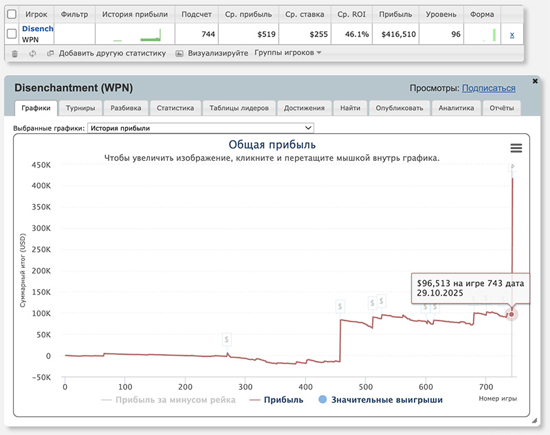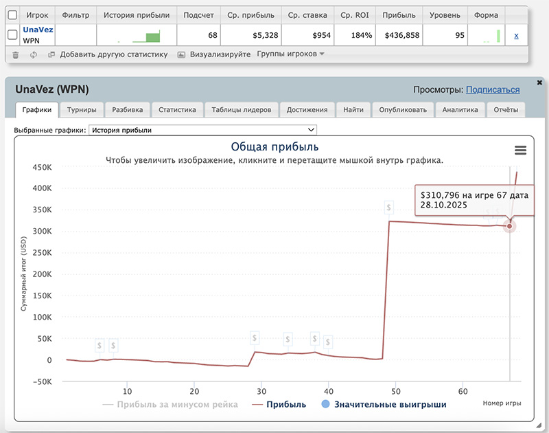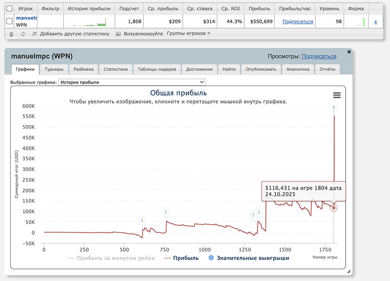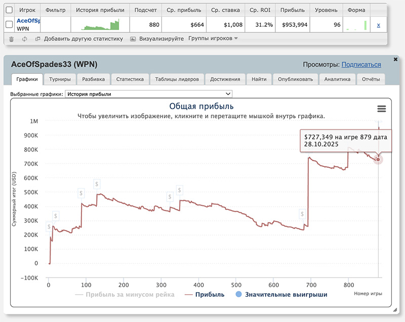 Благодаря третьему месту в Веноме график Матеоса на PokerKing на SharkScope достиг максимума в +$953K.