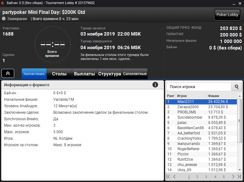 И лишь только $22 partypoker Mini прошёл без компенсаций. В турнире приняло участие 1688 игроков. Гарантия оказалась покрыта. Обладатель главного приза игрок под ником «Maxi2311» ($26.432).