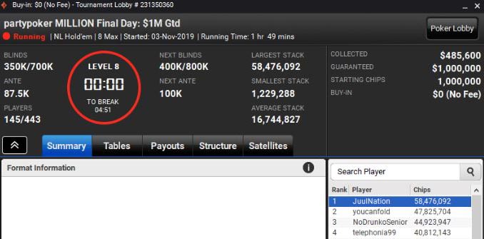 Финальный день должен был стартовать в 22:00. До этого в 18:00 в расписании был День 1D турнира partypoker MILLION. Но турнир пошёл не по плану. И игроки из дня 1D не смогли зарегистрироваться в День 2. В общей сложности, в турнире должно было участвовать 809 человек, но сыграло лишь 443.