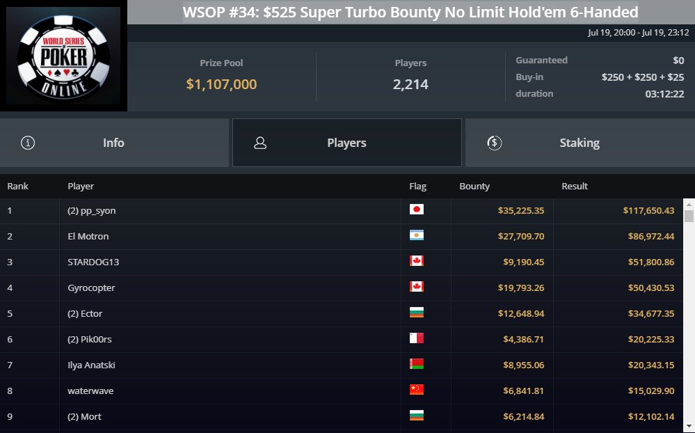 Турнир WSOP #34: $525 Super Turbo Bounty привлёк 1681 игрока (всего 2214 входов), а призовой фонд составил $1,107,000. На финальном столе игра шла под реальными именами, среди которых была парочка всемирно известных, включая белоруса Илью «Legenden» Анацкого.