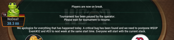 Мы приносим извинения за все, что произошло сегодня. Во время игры была обнаружена критическая ошибка, не позволяющая корректно закончить некоторые турниры. Нам пришлось отложить WSOP Event # 32 и # 33 на следующую неделю, в то же время начала. Все начнут с текущего стека.