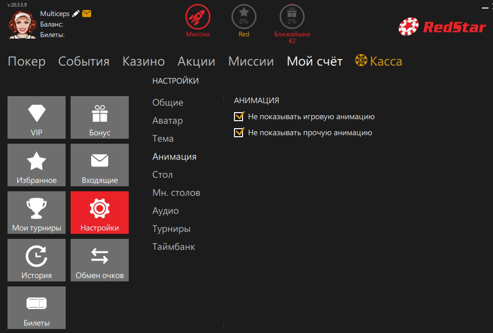 Третий — классная анимация может вызывать знатные тормоза на ПК, особенно при многостоловой игре. Если у вас, как это было у меня, вместе с RedStar запущена игра еще в одном-двух румах, а оперативки на компе или ноуте не слишком много, готовьтесь к периодическим лагам. Чтобы избежать этого, лучше отключить в настройках анимацию до начала катки.