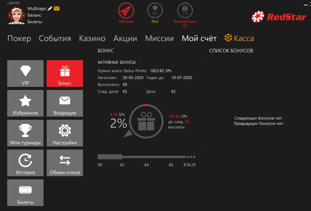Однако, для игроков RedStar такой проблемы не существует — здесь сумма бонуса отбивается небольшими частями по €2, которые начисляют сразу на кеш-счет. Бонус применяется автоматически при первом депозите, действует 60 дней и составляет 200% до €2K. Если вам срочно понадобится вывести деньги, то все отбитые вами части бонуса будут доступны для кешаута, а бонус останется действовать до истечения срока — однако, на суммы последующих депозитов распространяться не будет.