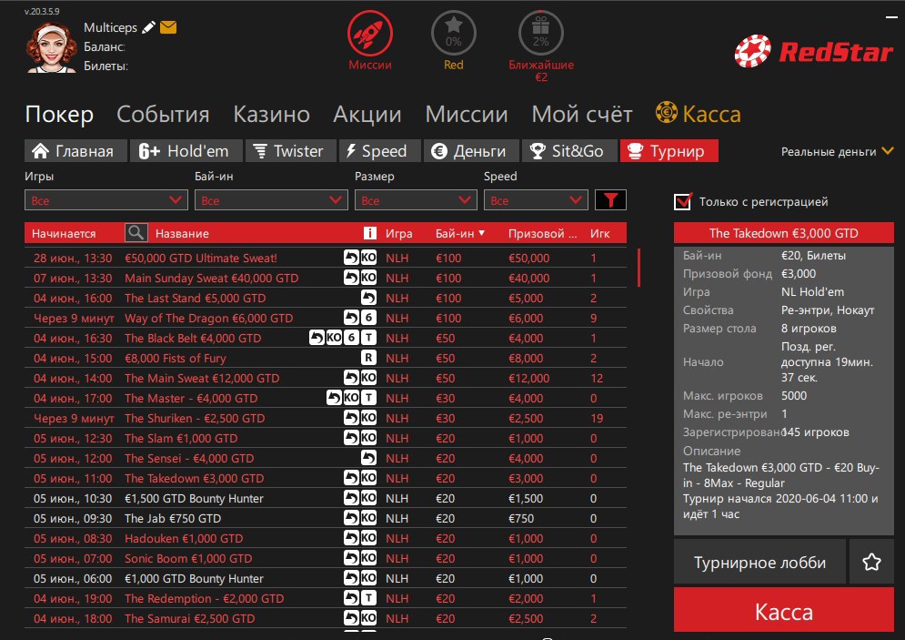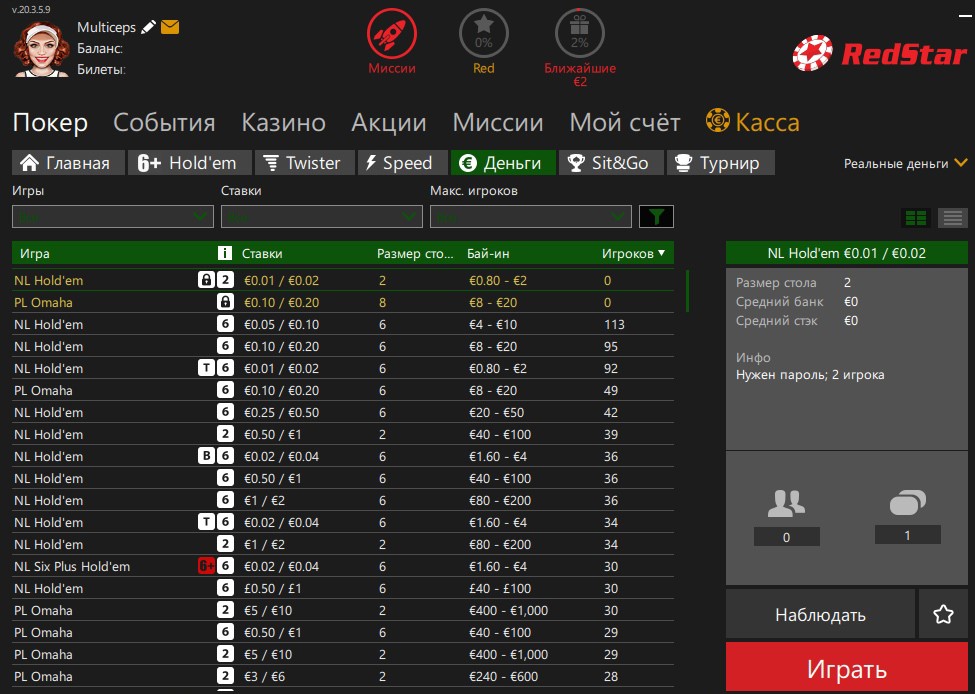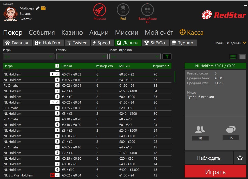 Поскольку мы уже сделали подробный обзор RedStar Poker, я не буду детально описывать лобби, доступные лимиты и подобные нюансы.