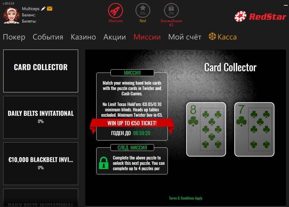 Также интересной особенностью рума являются «Миссии» — задания, выполнение которых дает игрокам дополнительные вознаграждения в виде билетов на специальные турниры. Например, в июне 2020 актуальна миссия «Card Collector», в рамках которой игрокам надо выигрывать раздачи с определенной рукой, собирая таким образом условные пазлы и получая в качестве приза скретч-карту с билетом от €0.50 до €50. Всего в этой миссии четыре пазла, каждый из них требует выигрыша с разным количеством рук — от 2 до 9, максимальное количество скретч-карт и призов по ним в день — пять.