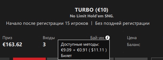 Первый — все расчеты рума производятся в евро и фунтах стерлингов, поэтому играя с долларового аккаунта, ты всегда платишь не одинаковую сумму, так как курс меняется. Например, бай-ин Sit&Go €10 на 2 июня обходился держателям долларового счета в $11.11. Причем, если в Твистерах (аналог Spin&Go) информация о сумме бай-ина в $ указывается на главной странице, то чтобы найти эту же инфу в турнирах, надо открывать турнирное лобби и нажимать на значок «i» рядом со словом «Бай-ин» в информации.