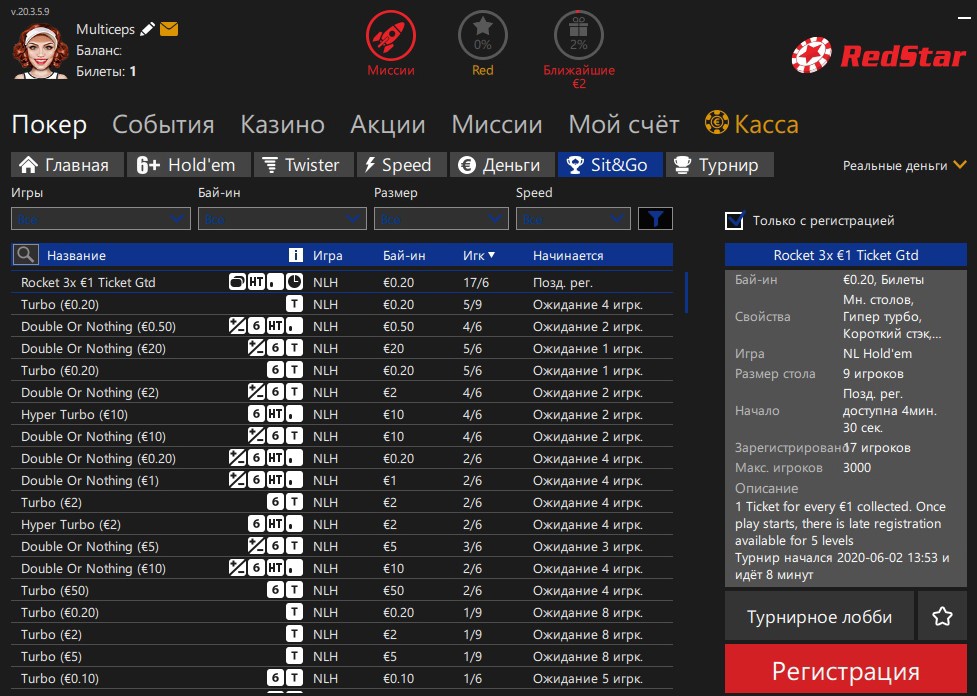 Что касается Sit&Go, то ситуация более чем стандартная — это один из наименее популярных форматов у многих румов, и РедСтар не исключение. Даже вечером в местных Sit&Go народу набирается немного — одностоловки заполняются очень медленно. В 20:00 МСК в турнирах от €10 до €5К можно увидеть не более 20 человек, большинство из которых сидит по одному за хэдзап-столами разного номинала. Однако на бай-инах до €5 игра идет вполне бодро — я сыграла несколько турниров и меня порадовало свежее и креативное поле, не менее интересное и активное, чем в МТТ.