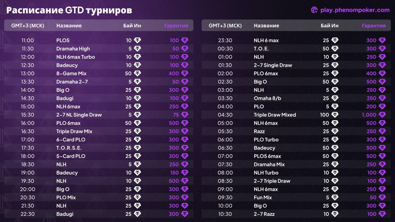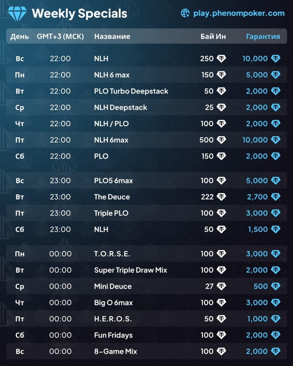 Расписание самых крупных еженедельных турниров Phenom Poker: