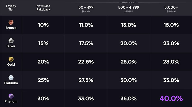 Также в зависимости от количества удерживаемых PHNM игроки будут получать дополнительный рейкбек. По обновлённой программе лояльности максимальный рейкбек будет достигать 40%.