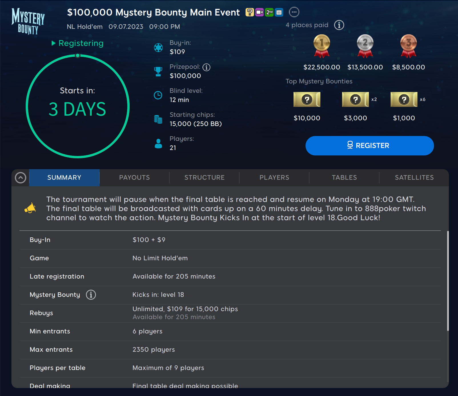 888poker: $109 Mystery Bounty Main Event $100K GTD (недоступно игрокам из РФ)