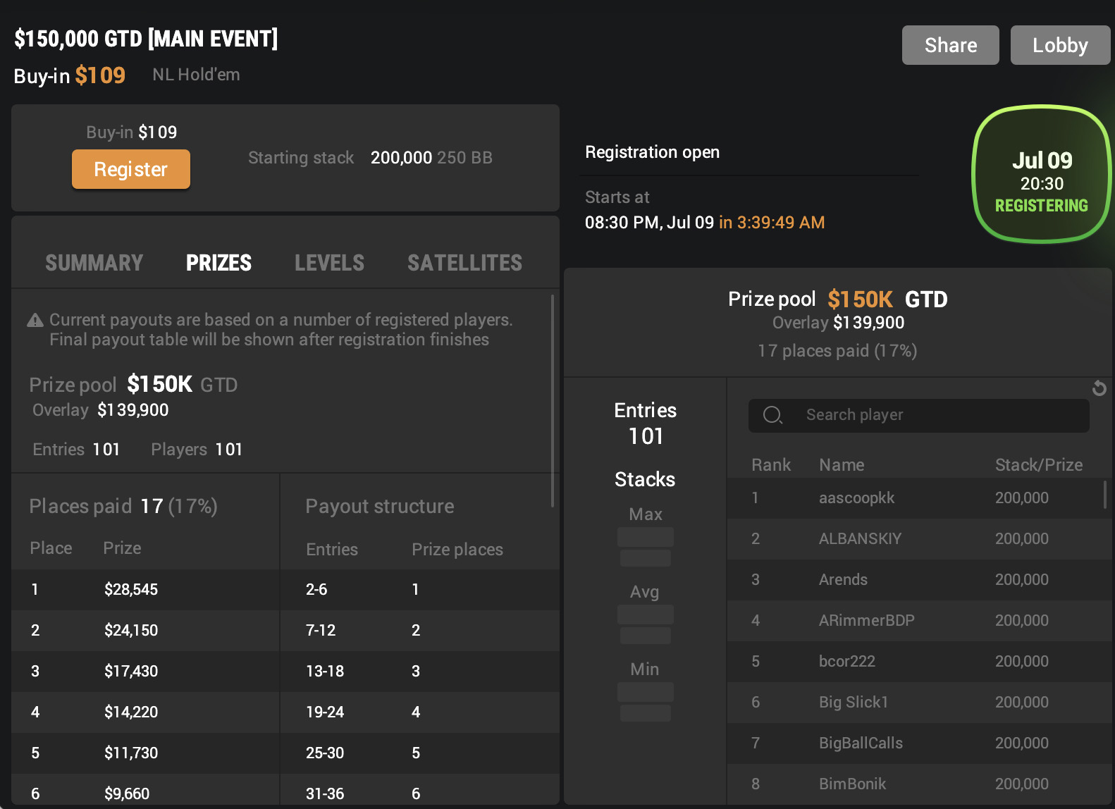 - 10 июля 02:45 МСК — $109 Sunday Showdown $45K GTD