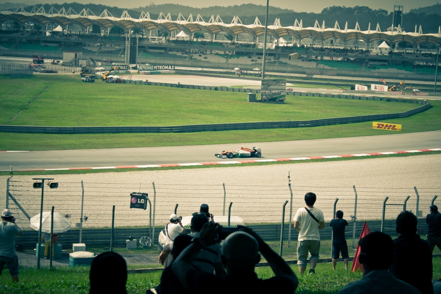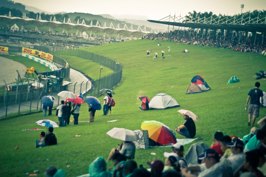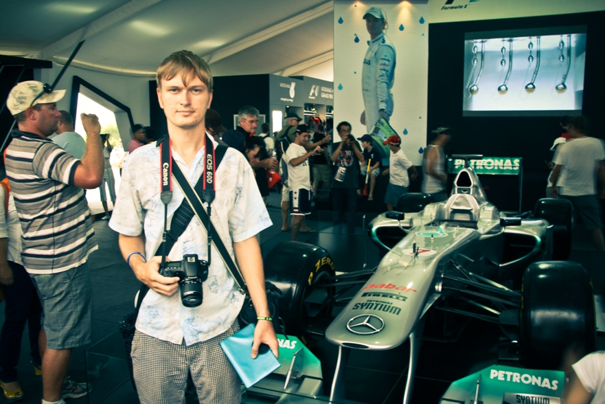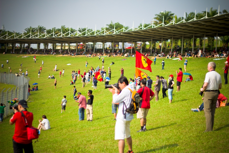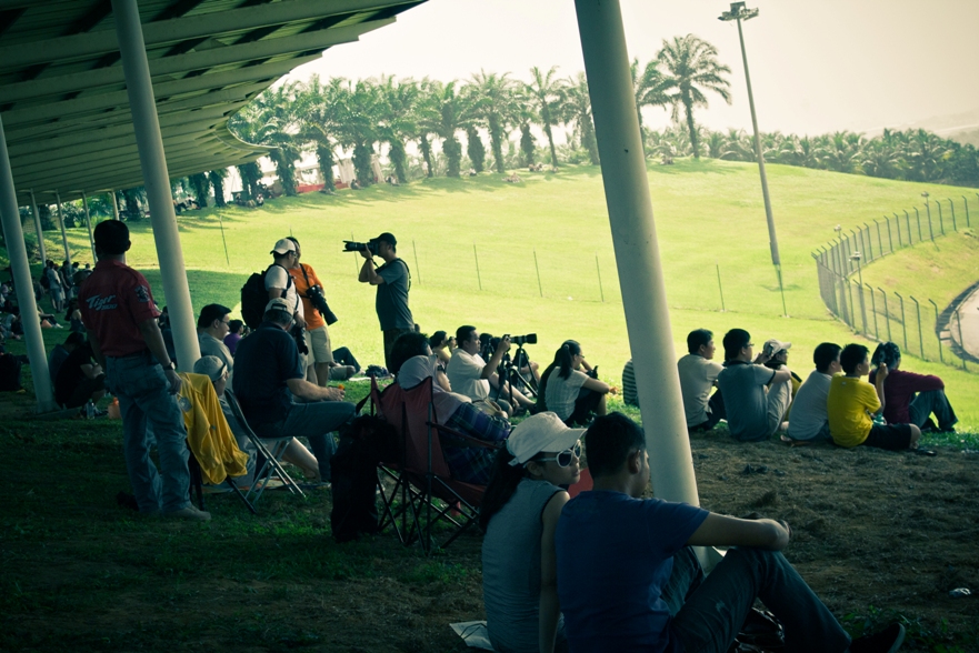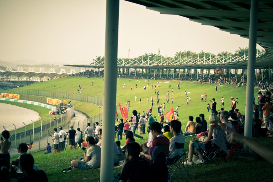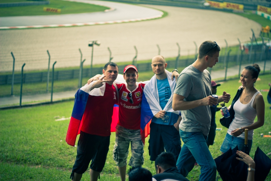 Наш сектор представлял собой склон, по верху которого шла аллея, как раз там располагались палатки с напитками и едой, чуть ниже был навес, ну а еще ниже поле, затем решетка и уже сама трасса. От нас хорошо было видно 9, 10 и 11 повороты, а также с 9 поворота хорошо видно длинную прямую, которая проходит вдоль main grandstand.