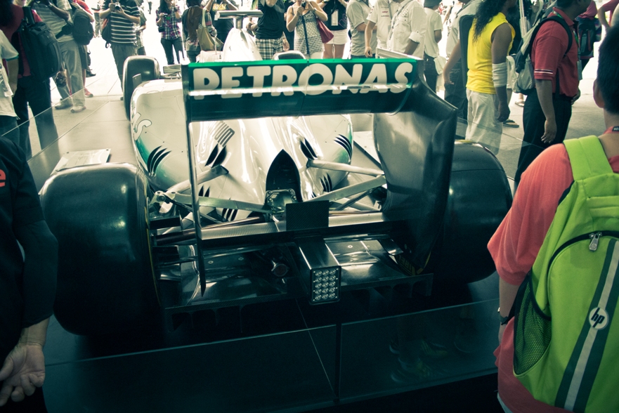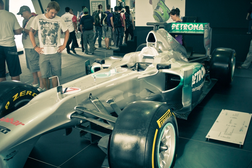На улице стояли красотки с сумками наполненными ред буллом, увы красота была лишь приманкой, оказалось что за напиток надо платить. Но в воздухе чувствовался манящий запах халявы. Мы с Витей направились к стендам с прототипом болида мерседеса. Там увидели милую девушку в строгом костюме с символикой мерседеса.