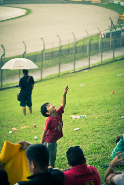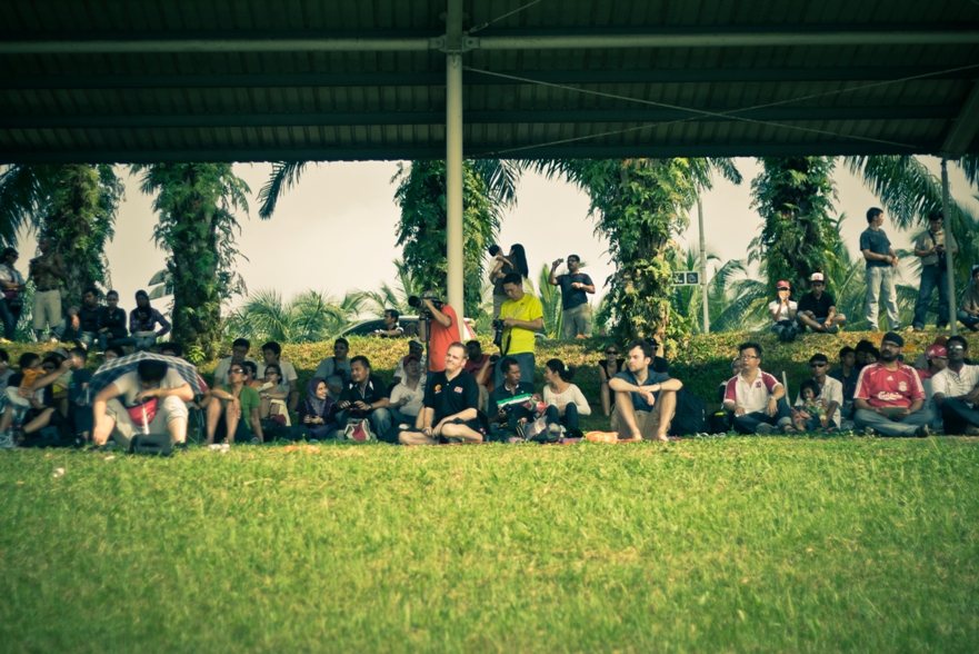 Ну а чем заняться в перерыве? Конечно, пофоткать болельщиков. Надо заметить, что первые круги мы смогли просидеть под дождем поближе к трассе, но вскоре перебрались под навес. Витя долго на одном месте сидеть не хотел и решил пойти по холму, пофоткать другие ракурсы. На всякий случай договорились, что встретимся за 10 минут до конца гонки в определенном месте. Но это было еще до ее остановки. После остановки я Витю уже потерял из виду и становилось не понятно, когда будет окончание гонки, а значит и время встречу можно трактовать по разному. Но пока еще было много времени и я сосредоточился на фотографии.