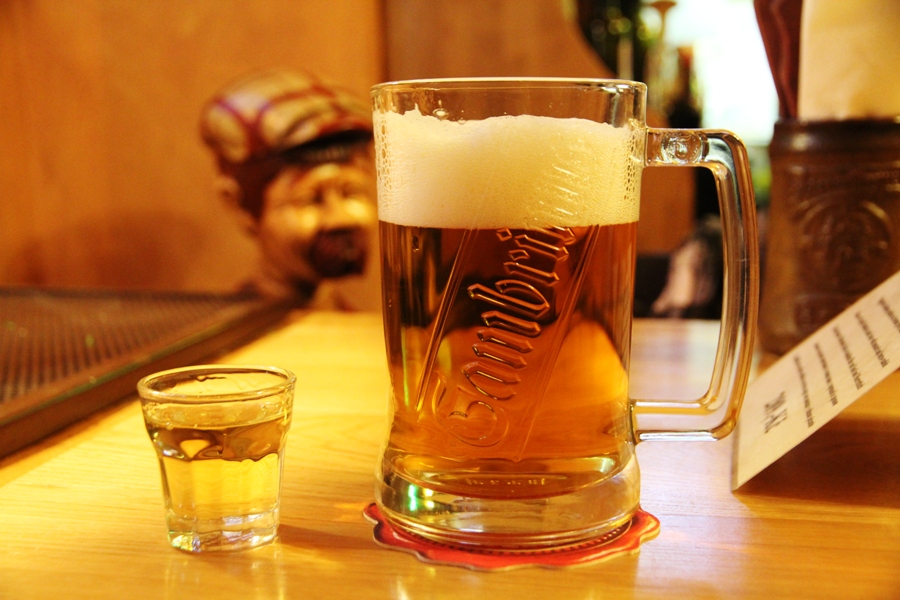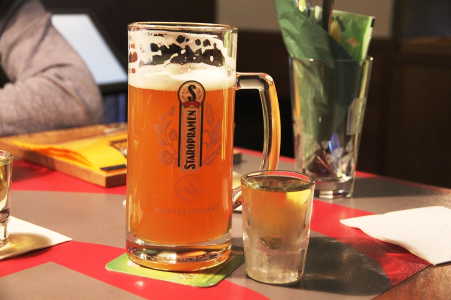 Пиво без водки бехеровки - дeньги на ветер! Слева нефильтрованный Staropramen, справа охлажденная рюмочка Бехеровки - чешский ликер (38%), настоянный на травах. Первоначально этот ликер создавался как желудочное лекарство. Пиво в среднем по 30-40 крон (50-60 рублей).