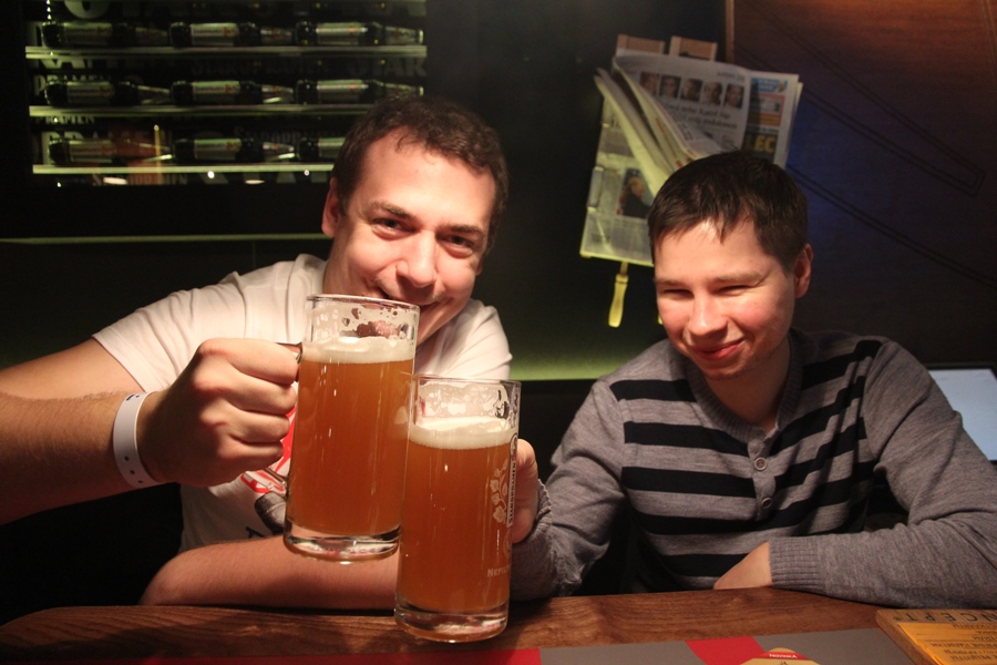 Несмотря на то, что пиво разливают везде, хорошее подают не в каждом заведении. Старайтесь искать пабы со своей пивоварней, вот там оно просто волшебное. В кадре Максим Streltcoff и Евгений eugene_support радуются, что нашли правильное пиво. На заднем плане газета с ручками (после пива решили что это сушилка для газет).