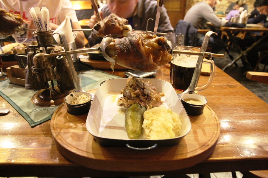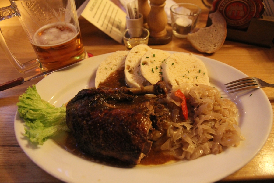 Самое популярное блюдо в Чехии - печено вепрево колено (Читай свиная рулька). Подается на небольшом вертеле с овощами. На самом деле с непривычки поглотить полностью это блюдо довольно трудно, из нас троих никто не справился, но было очень вкусно. Цена в среднем 250 крон (400 рублей).