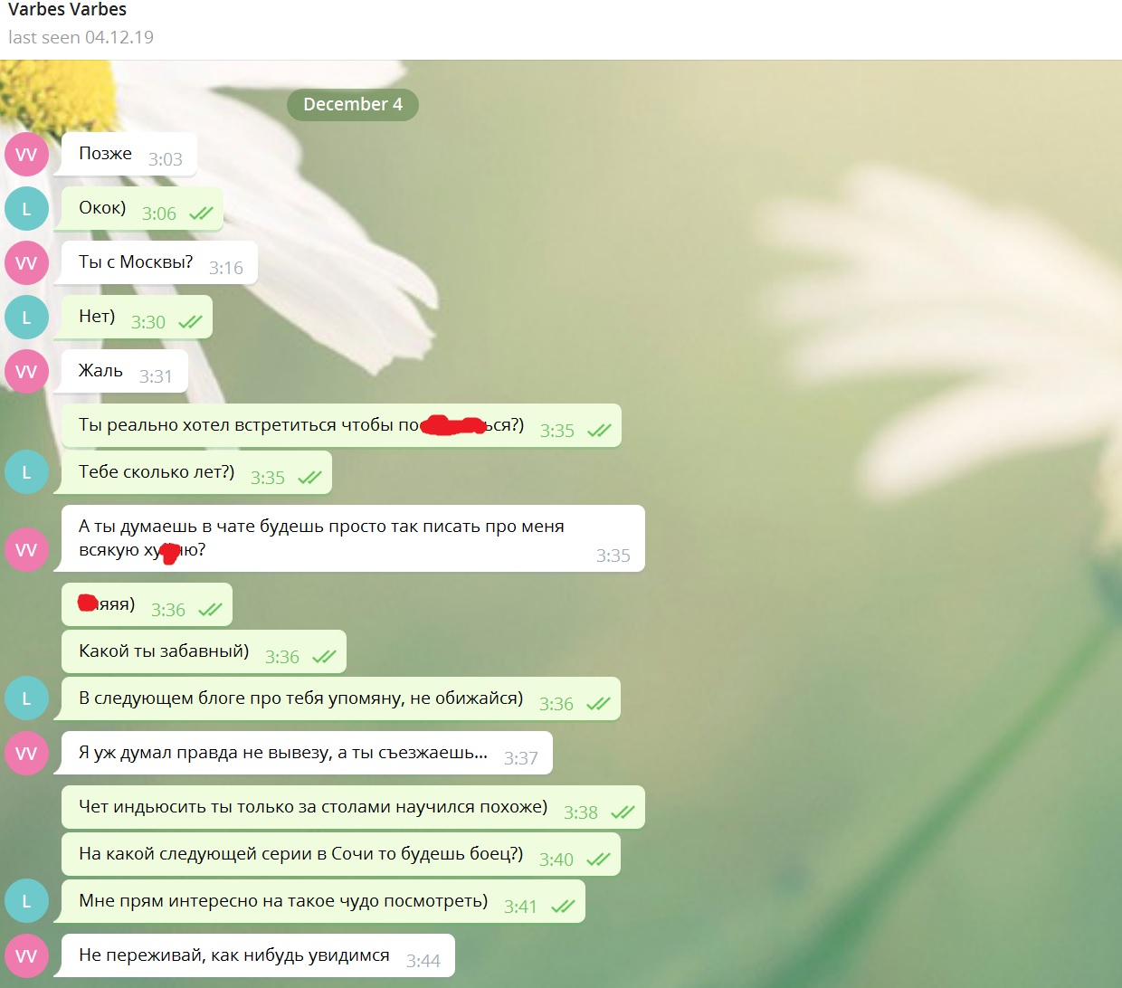 Ладно, невелика потеря, тем более, что есть более веселые инфоповоды. Намедни зацепились в чате с моим лютым другом spoubledy. И то ли ему не понравилось, как я его отслоуроллил в крайнем х10 на 250-ках, то ли в него так сильно попал тот обличительный пост, но парня переклинило, он спросил у меня телеграм и начал угрожать: