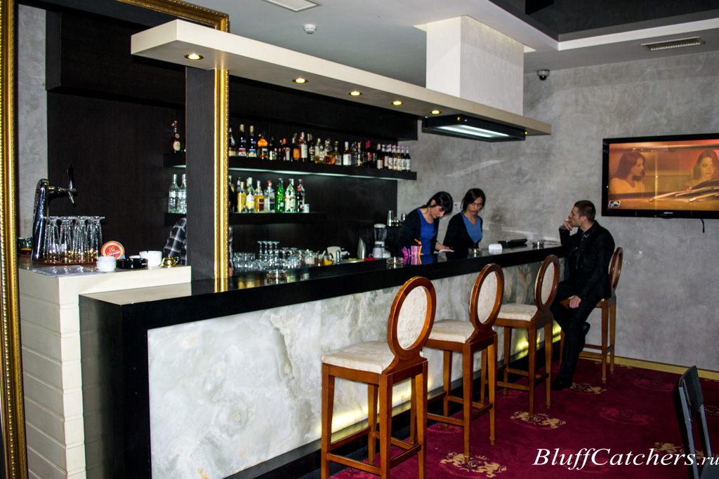 В противоположной входу части зала находится небольшой уютный бар с несколькими столиками и диваном. Игроки, онлайн покер рума Europe-Bet, получают скидки в баре. В зависимости от VIP уровня это может быть скидка в 30, 50 или 100 процентов. По традиции покерных клубов Тбилиси в любой момент времени на расстоянии «вытянутой руки» от игрока находится официант, готовый принять заказ. Гости могут заказать блюда как грузинской, так и европейской кухни, ну и конечно различные напитки.