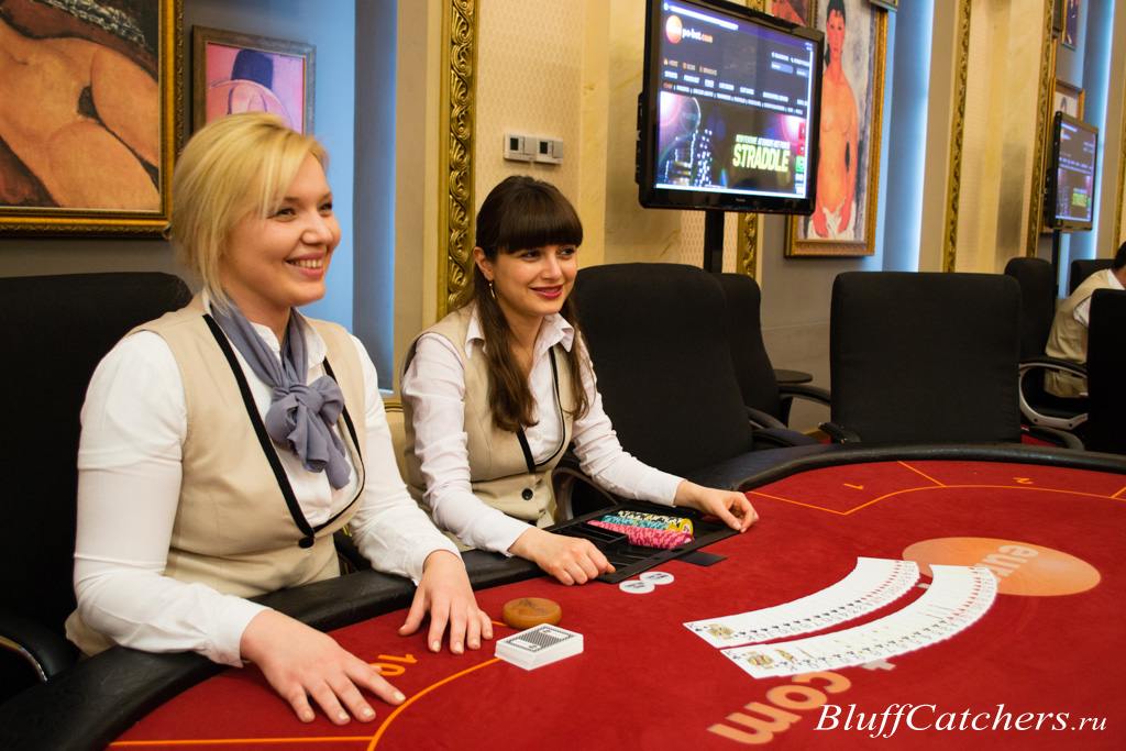 Дилера работают быстро, но смена дилеров и обмен дeнeг на фишки за столом происходит неоправданно долго. За кеш столами всегда находится два дилера. Вроде как второй должен мешать колоду, дабы ускорить игру, но получается это плохо, так как ему еще вменены обязанности инспектора. Недавно я предложил мазу, что за 30 минут до меня не дойдет баттон (я был на позиции CO, стол 9 мах). А предложил я этот спор знакомому менеджеру покерного клуба из Еревана, тот на мгновение задумался и отказался…