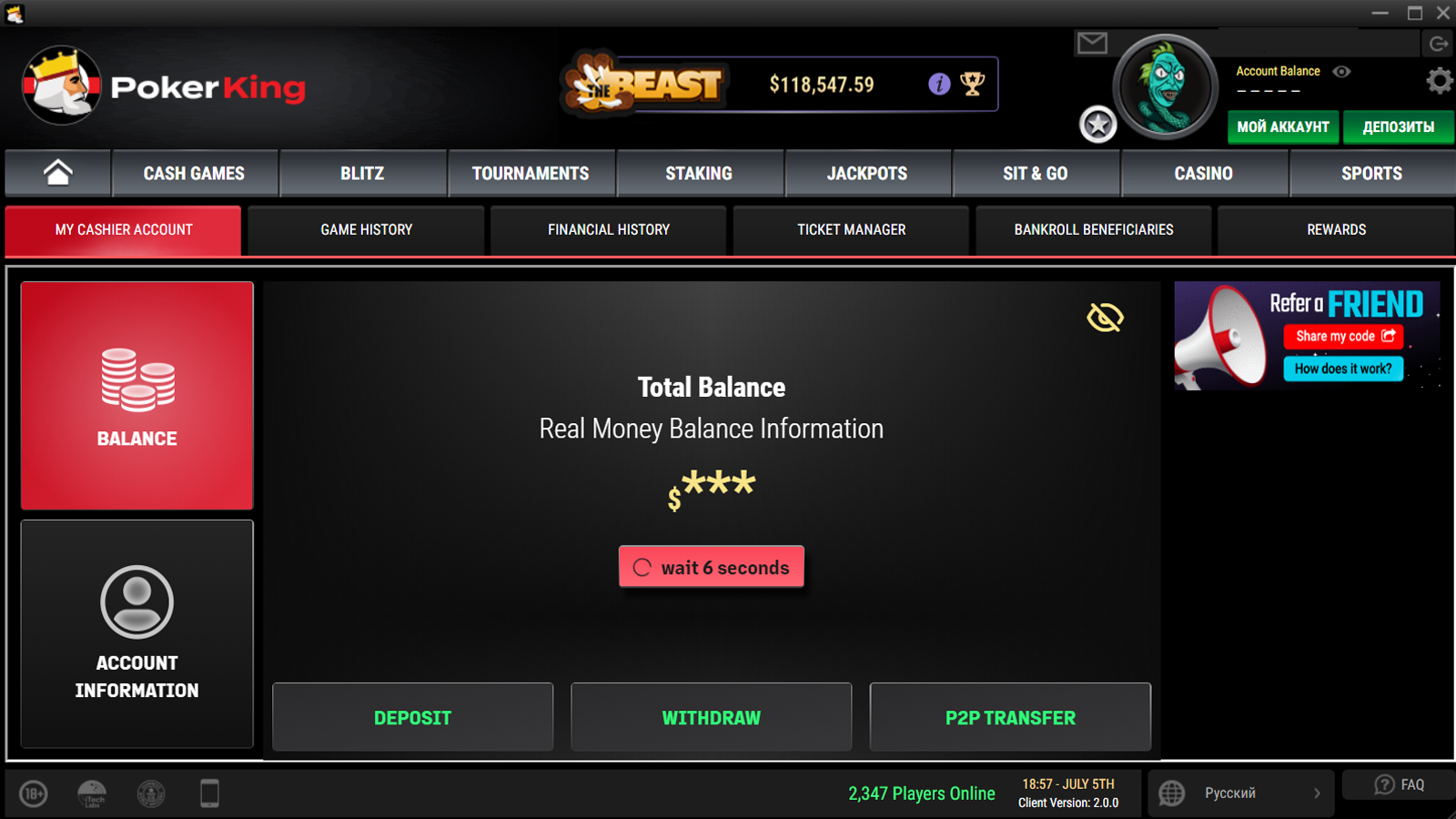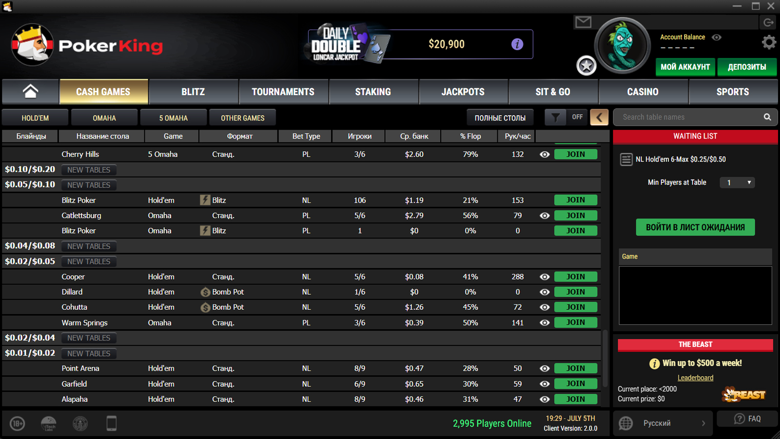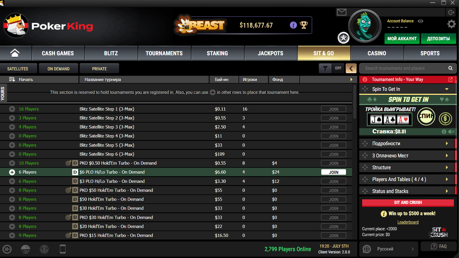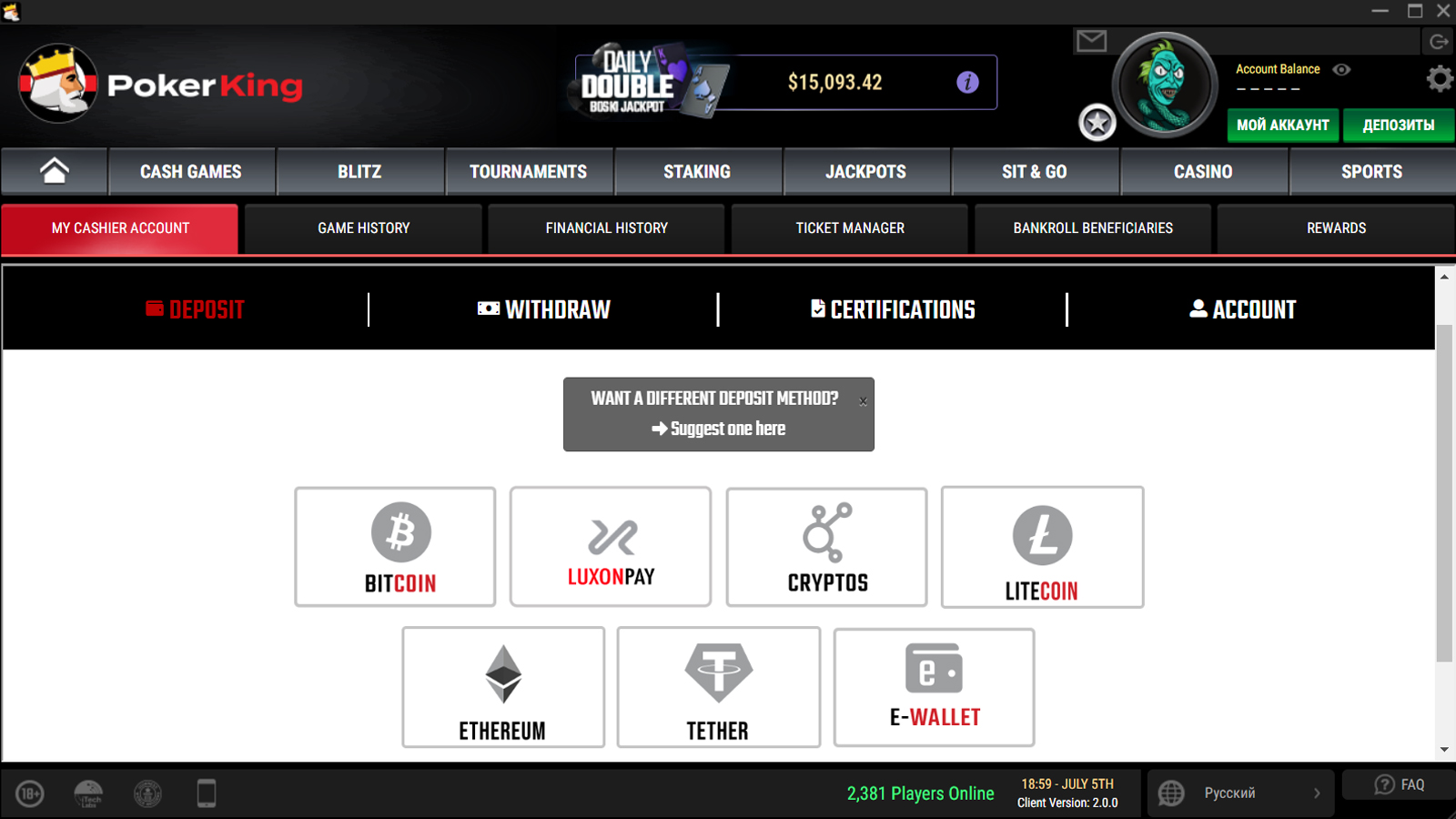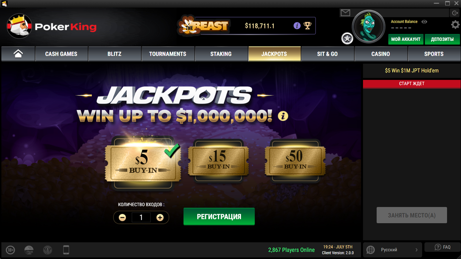 Минимальный размер депозита в Bitcoin на PokerKing — $5. Максимальный для РФ и Беларуси — $25,000, но предел разнится между странами.