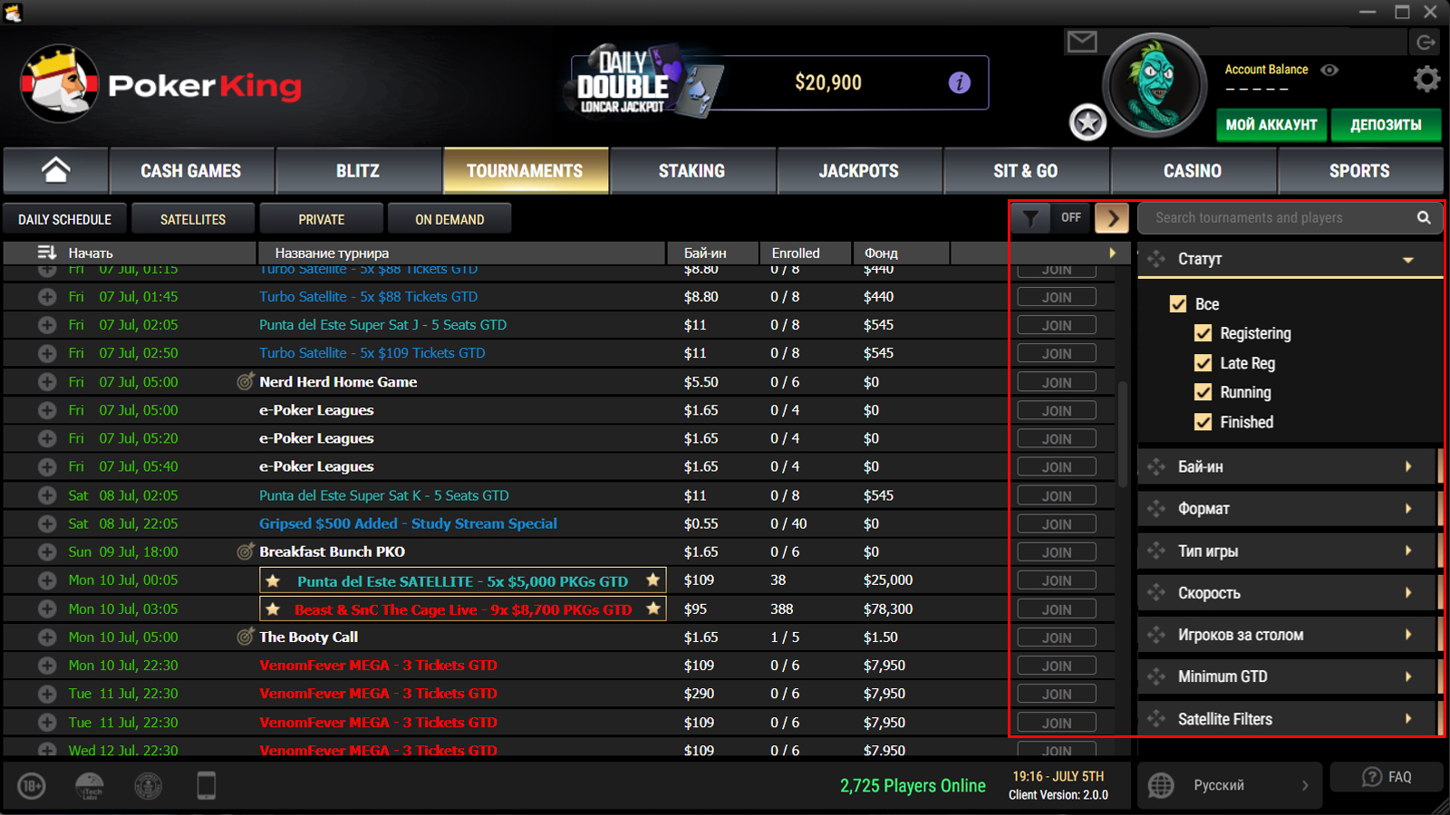 Также рум отделил от основного расписания две группы турниров: значимые события и турниры, в которых зарегистрирован авторизовавшийся игрок.