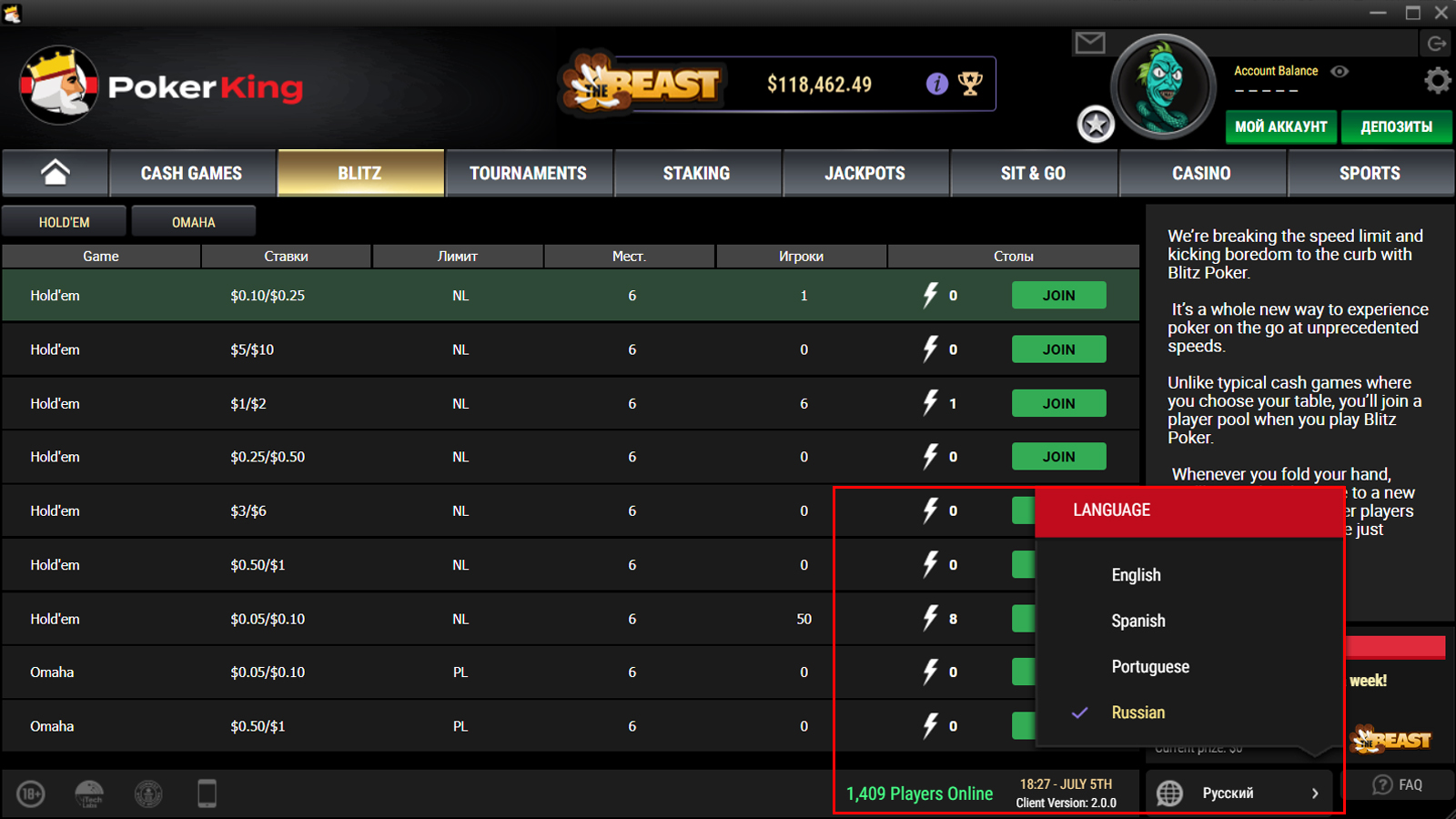 Игрокам стала доступна информация о количестве игроков в руме онлайн в данный момент — она отображается ближе к правому углу клиента. Рядом можно выбрать язык лобби — английский, испанский, португальский и русский — но на русский язык перевод по-прежнему лишь частичный.