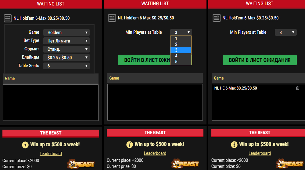 При этом порядок работы листа ожидания для полных столов изменился. Теперь у игроков нет возможности выбрать стол, к которому они хотят встать в очередь. Вместо этого им нужно выбрать лимит и минимальное количество игроков за столом для их посадки.