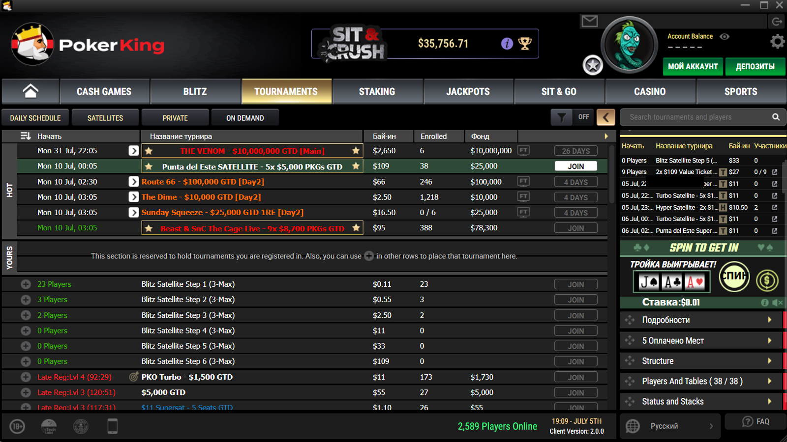 Количество аналогов Spin&Go — турниров Jackpots — сократилось до трёх с бай-инами $5, $15 и $50 и джекпотами до $1,000,000. Никакой информации об их множителях, структурах и вероятностях пока в лобби нет. После получения информации от наших партнеров из PokerKing, этот раздел статьи будет дополнен.