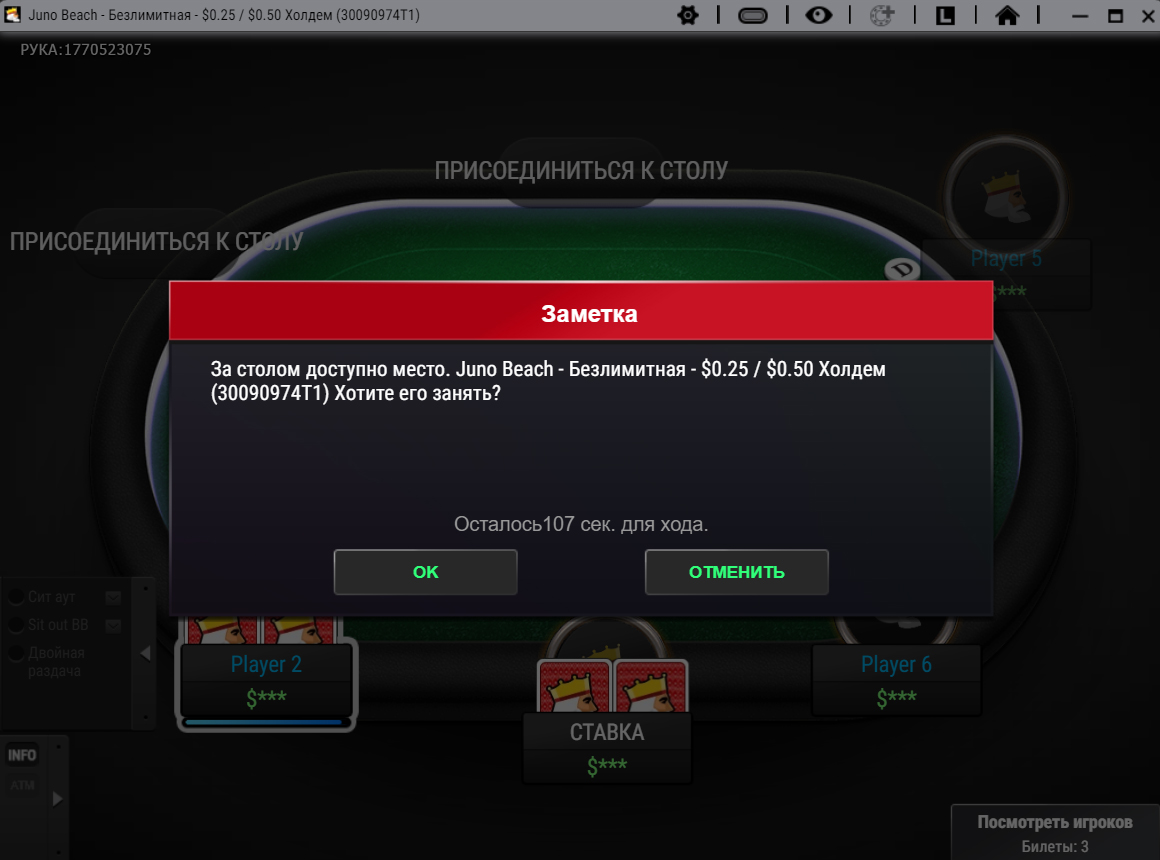 После попадания в очередь рум при появлении места откроет подходящий стол и предложит сесть за него.