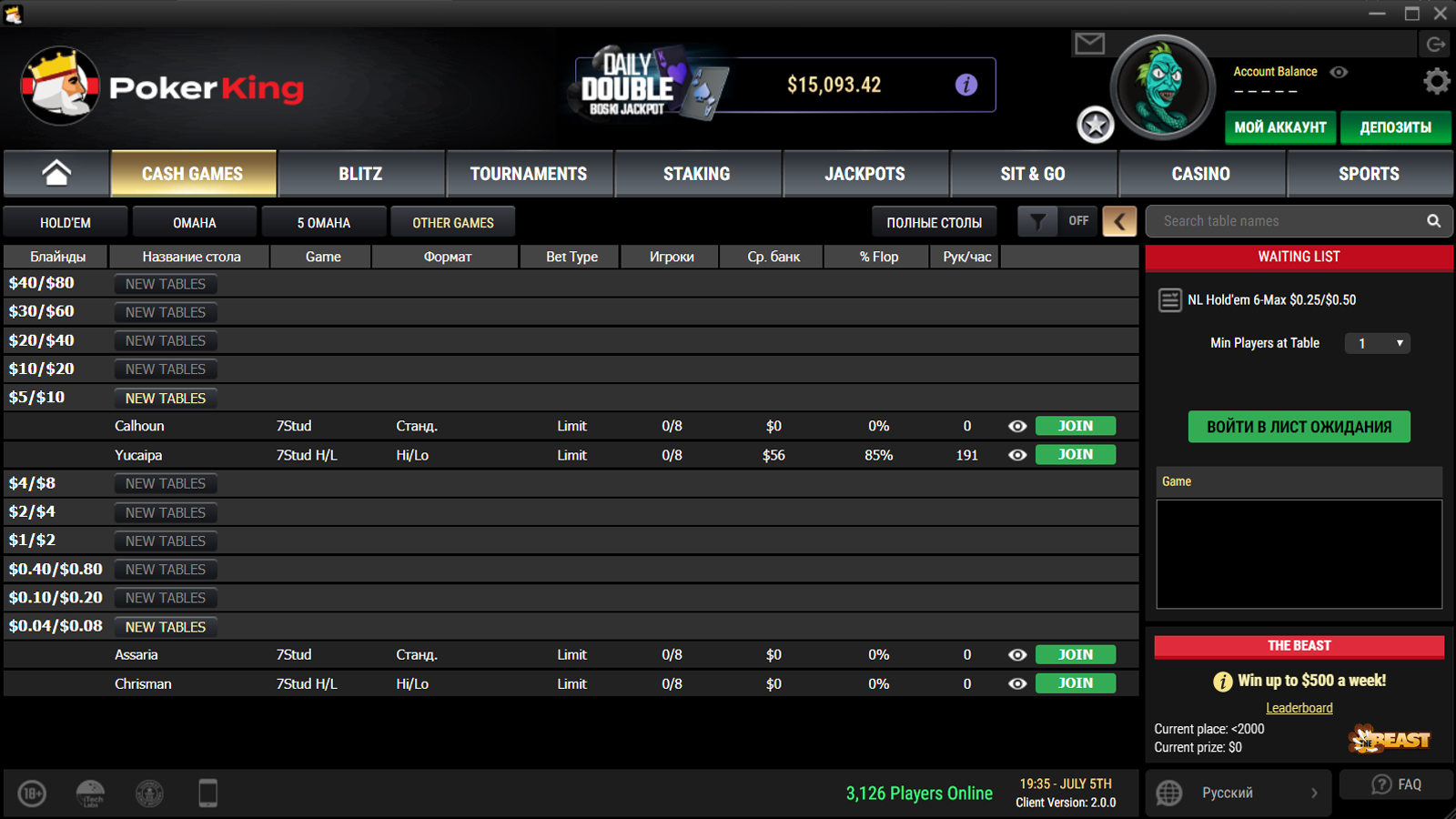 Из-за очевидной популярности NLH, PLO и PLO5 по сравнению со Stud, PokerKing оставил именные вкладки в разделе Cash Games только для первой тройки. Stud же теперь находится в разделе «Other Games».