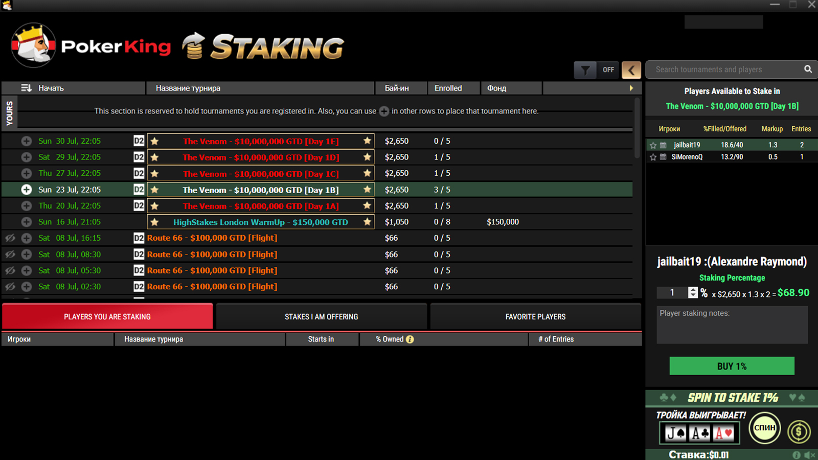 Стейкинг теперь вынесен в отдельную вкладку, но не открывается внутри лобби как его часть: при нажатии на вкладку появляется отдельное окно «PokerKing Staking» с турнирами, в которых можно продавать и покупать доли.