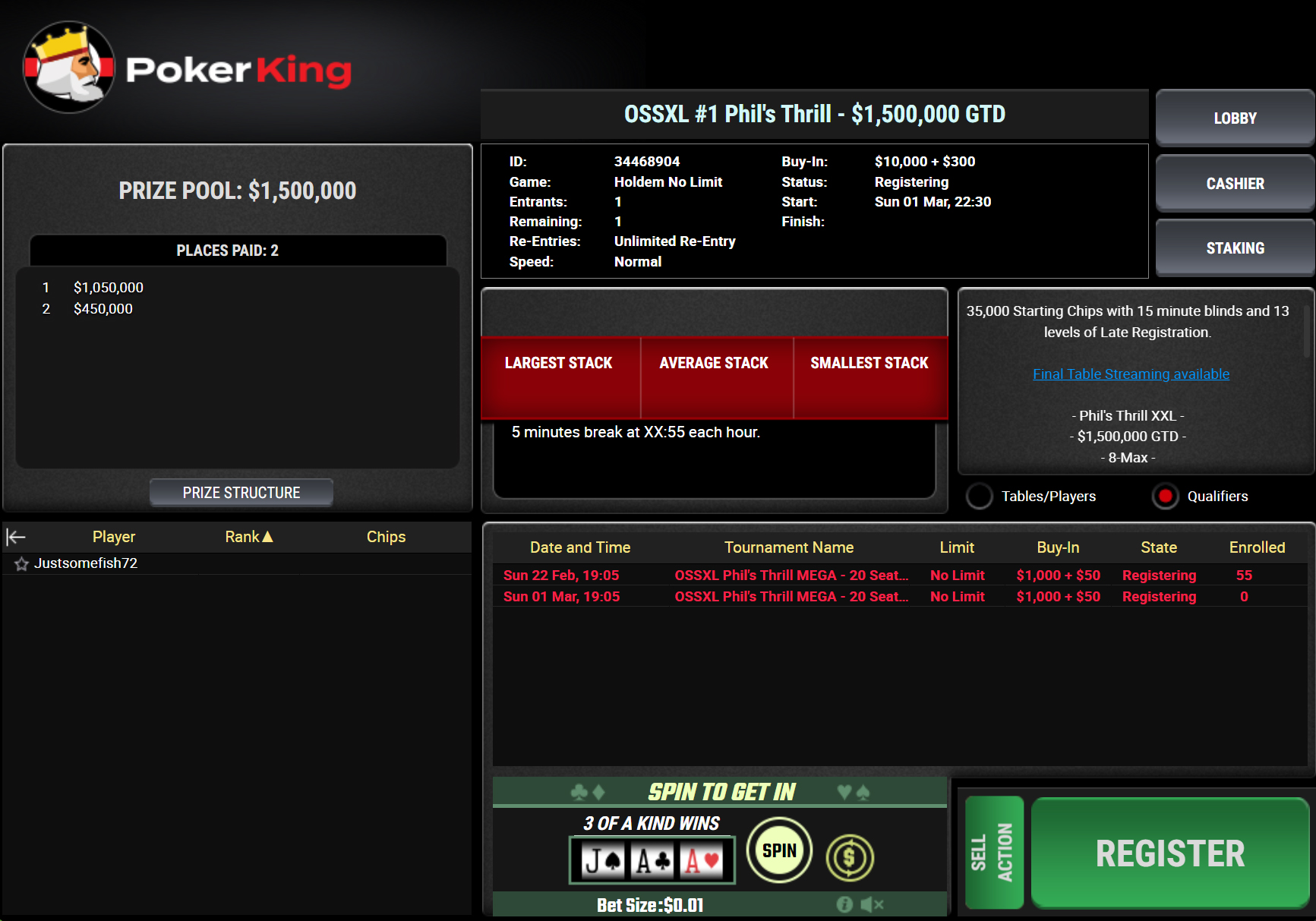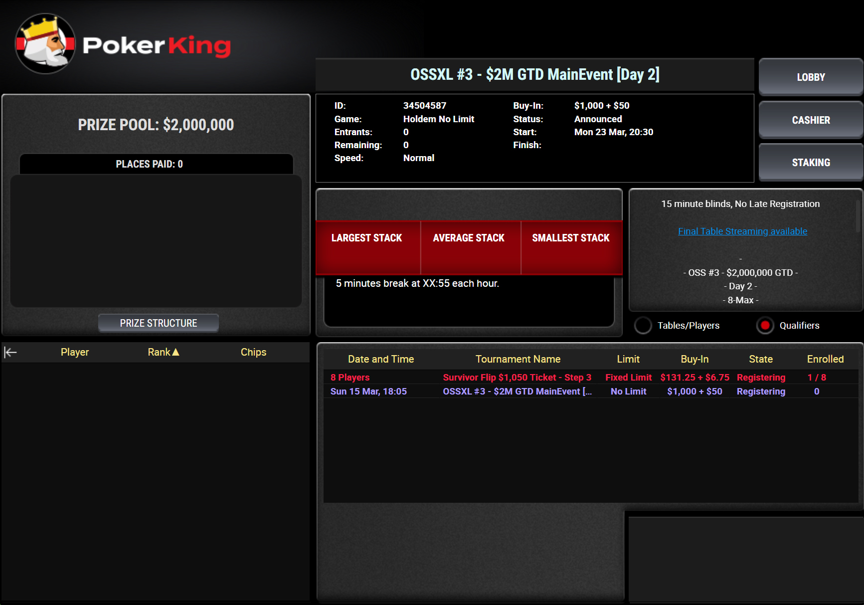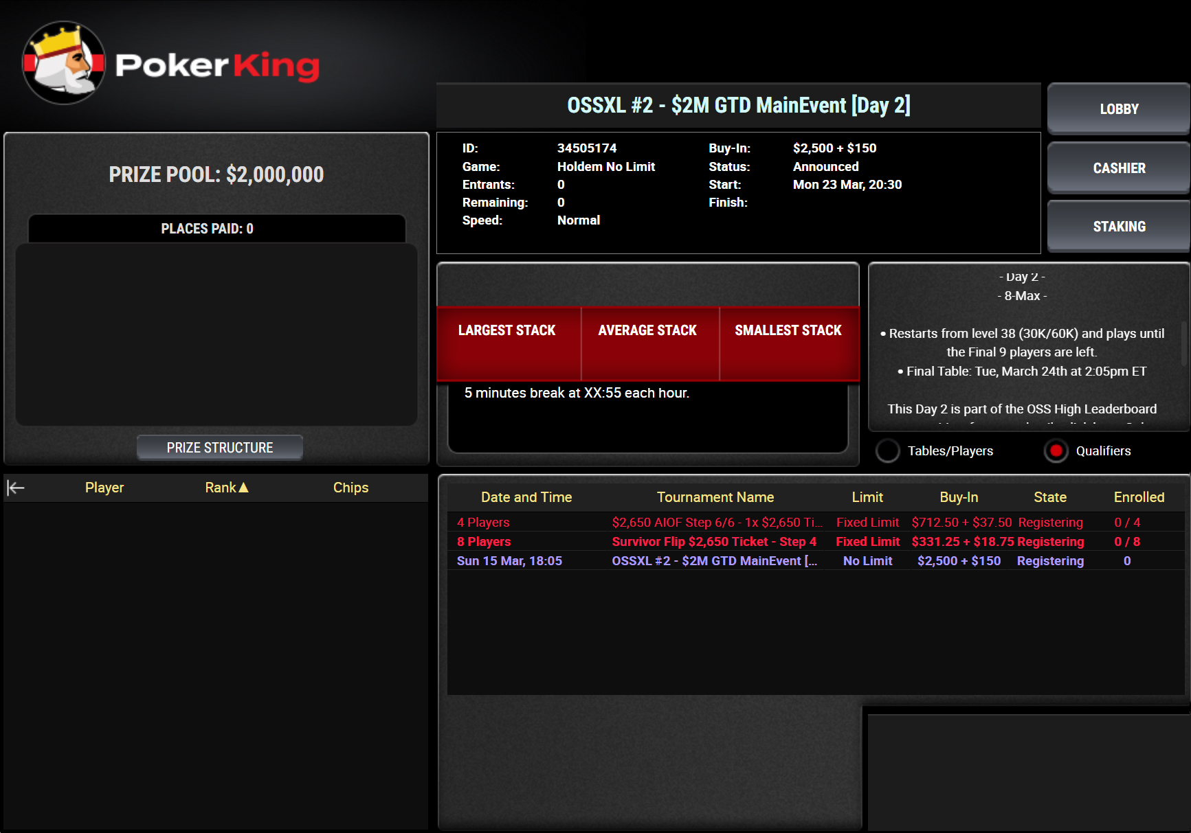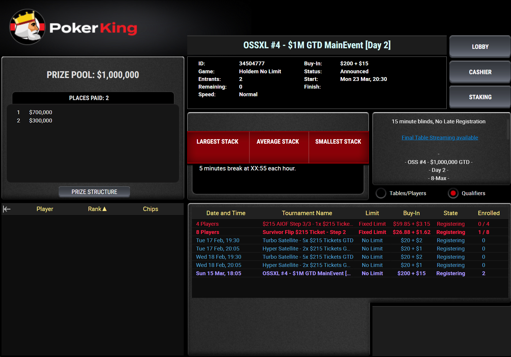 Весну этого года PokerKing встречает серией из 754 турниров с бай-инами от $0.55 до $10,300 и гарантиями от $250 до $2,000,000. Большая часть расписания традиционно состоит из Безлимитного Холдема.