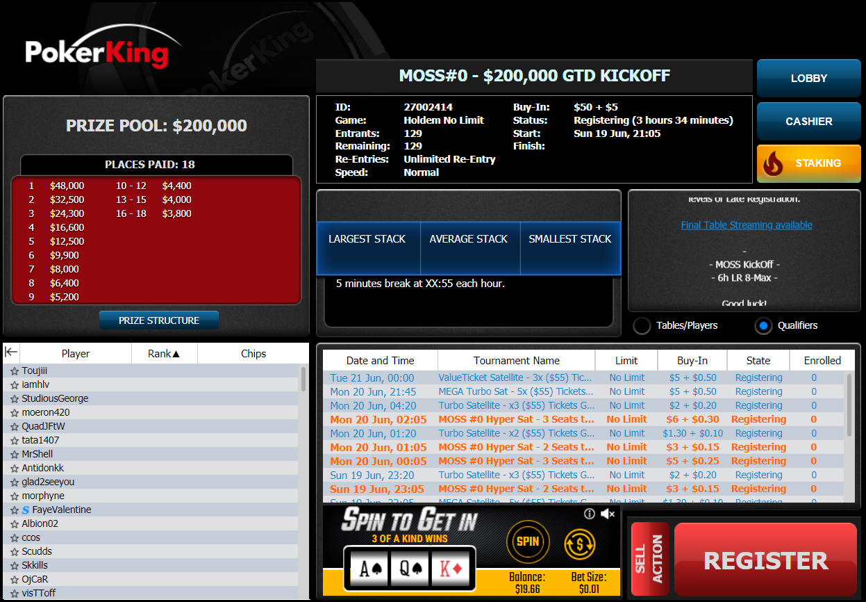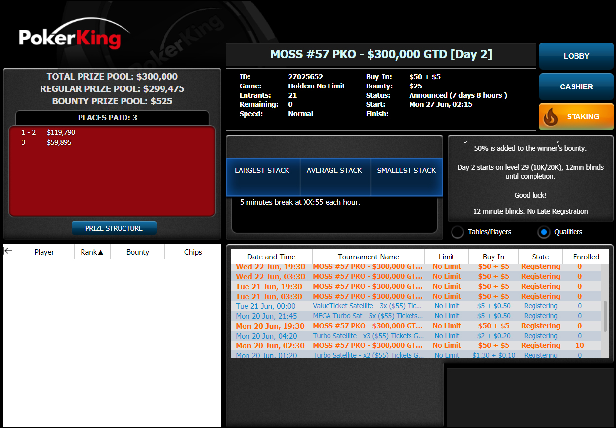 Про последний известно немного, поскольку в лобби PokerKing и в расписании на сайте рума его пока нет — он появится ближе к третьей неделе серии. Бай-ин второго Мейна — $22, гарантия — $210K, флайты стартуют с 26 июня по 3 июля, в последний день их проведения стартует Day 2.