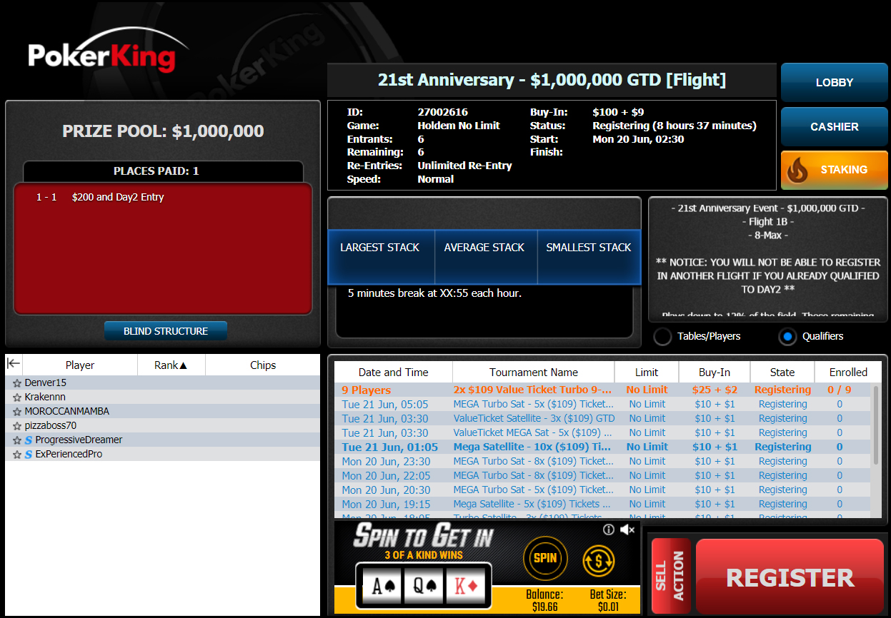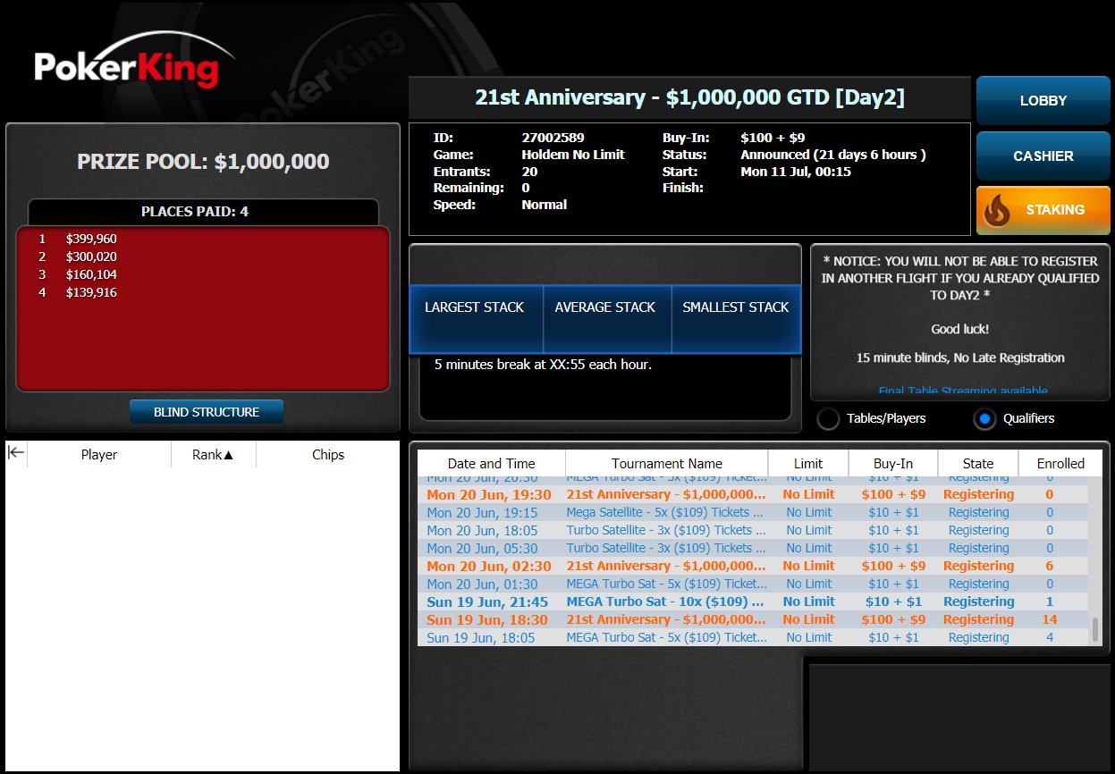 В честь дня рождения WPN, на PokerKing пройдёт $109 21st Anniversary с гарантией $1,000,000. Турнир мультифлайтовый — флайты стартуют каждый день с 19 июня по 10 июля по следующему расписанию:
