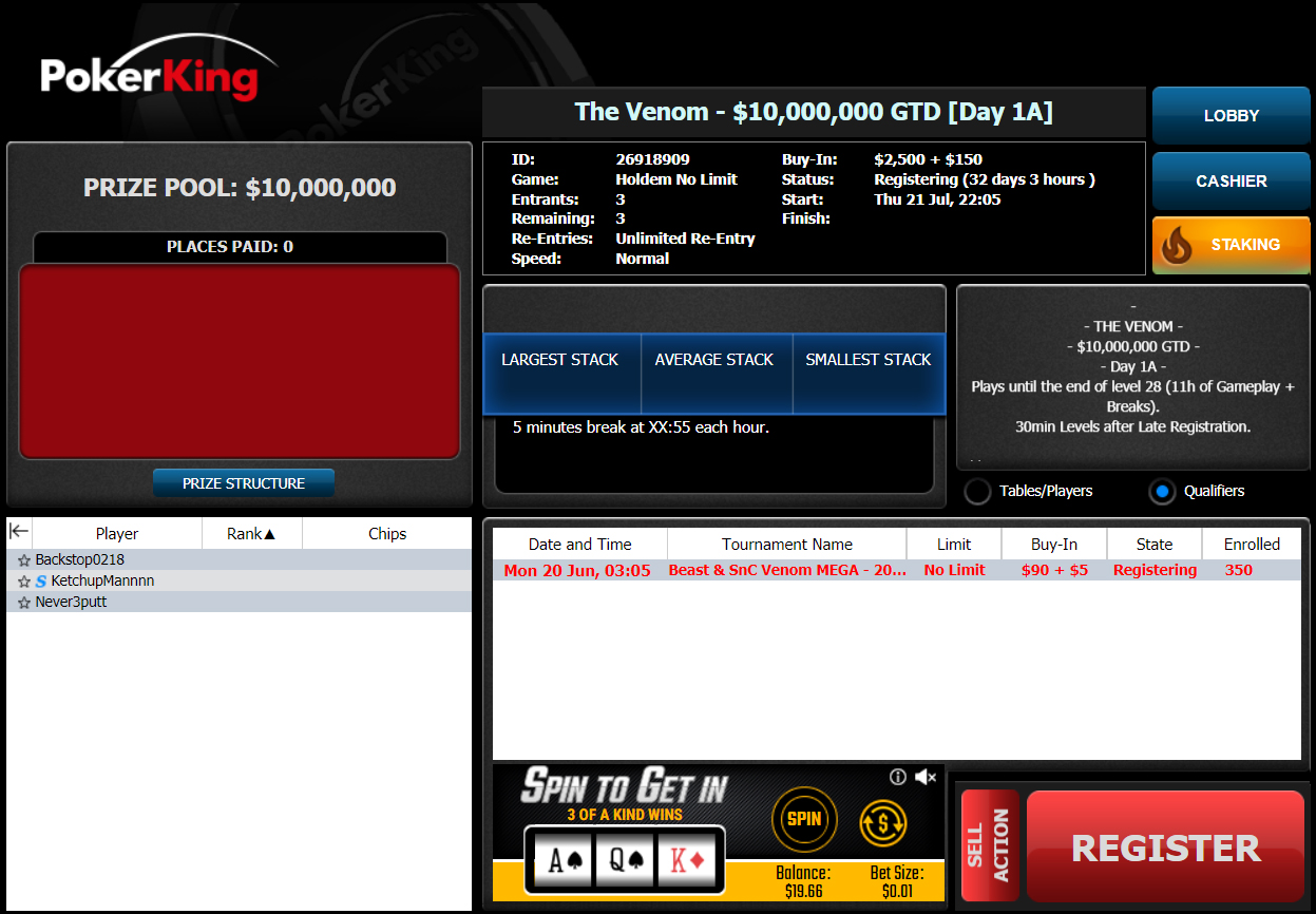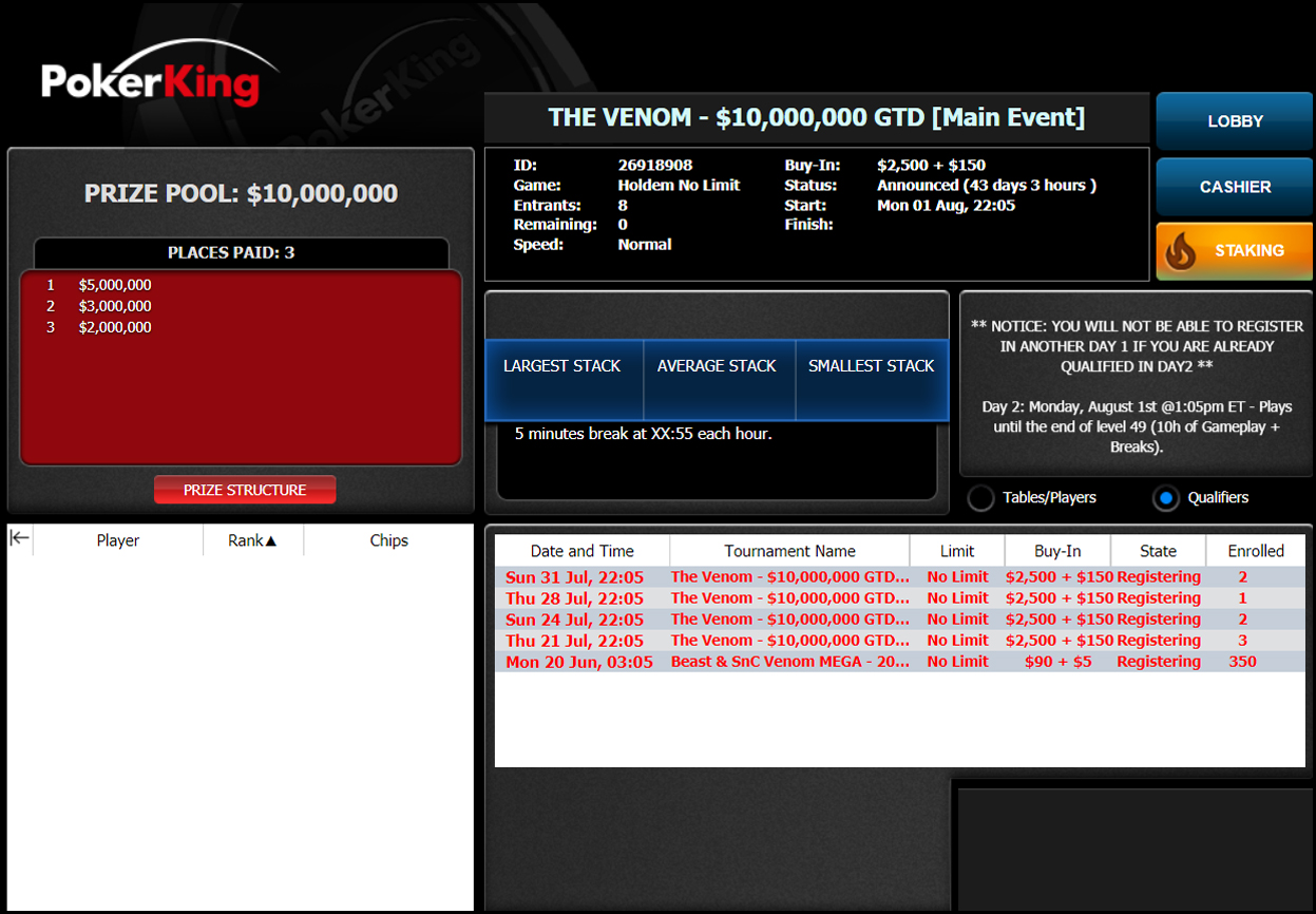 С 21 июля по 1 августа на PokerKing также пройдёт специальный вариант The Venom — с обычным бай-ином, но без нокаутов и с увеличенной до $10M гарантией (в последний раз она составляла $5M).